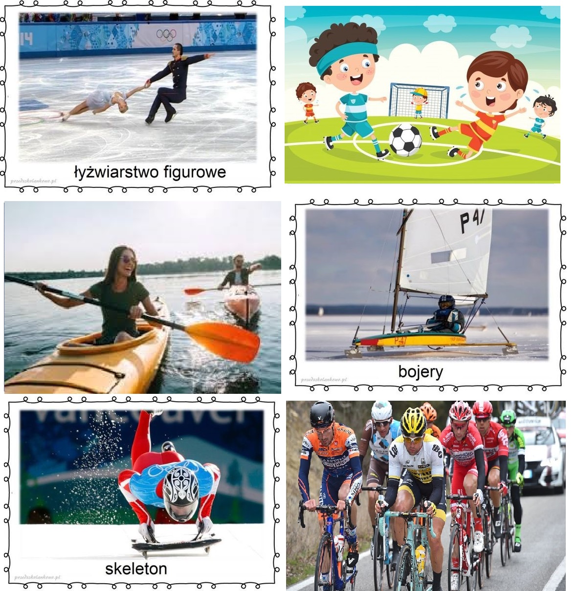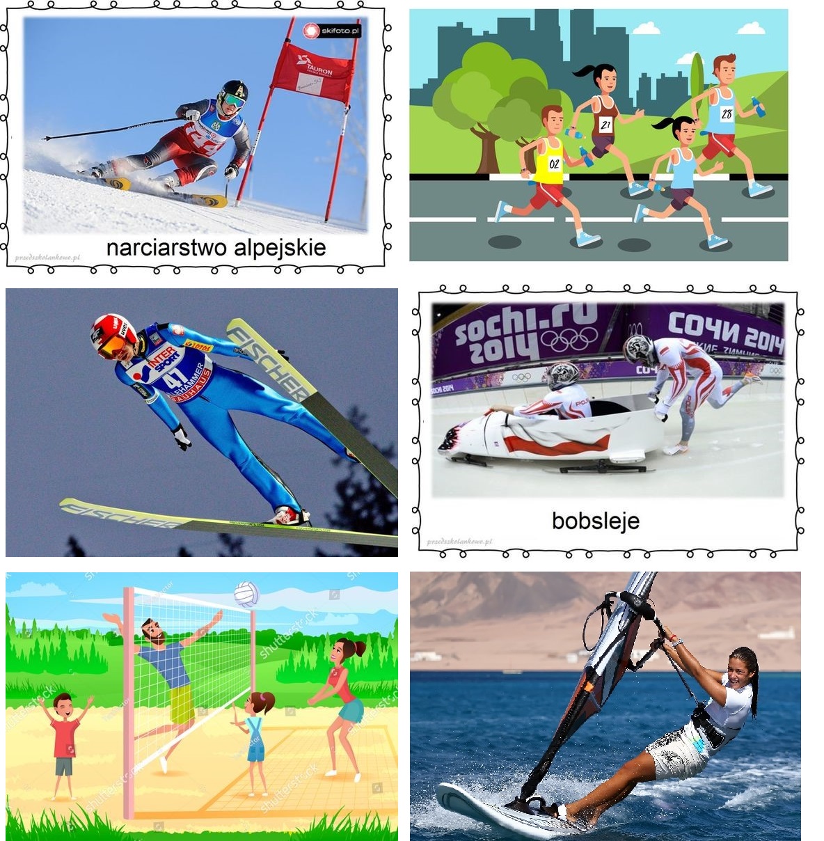 Poniżej macie różne sporty. NA podłodze połóżcie dwa koła zrobione ze sznurka lub z czegoś innego. Jedno koło oznaczcie słoneczkiem przez siebie narysowanym oraz drugie śnieżynką lub bałwankiem. Słoneczko oznaczać będzie sporty letnie, a bałwanek-śnieżynka sporty zimowe. Potnijcie kartę poniżej i do dzieła.