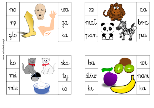 - Wytnij obrazki wraz z sylabami. Ułóż z sylab wyrazy i przyklej je pod odpowiednimi ilustracjami.