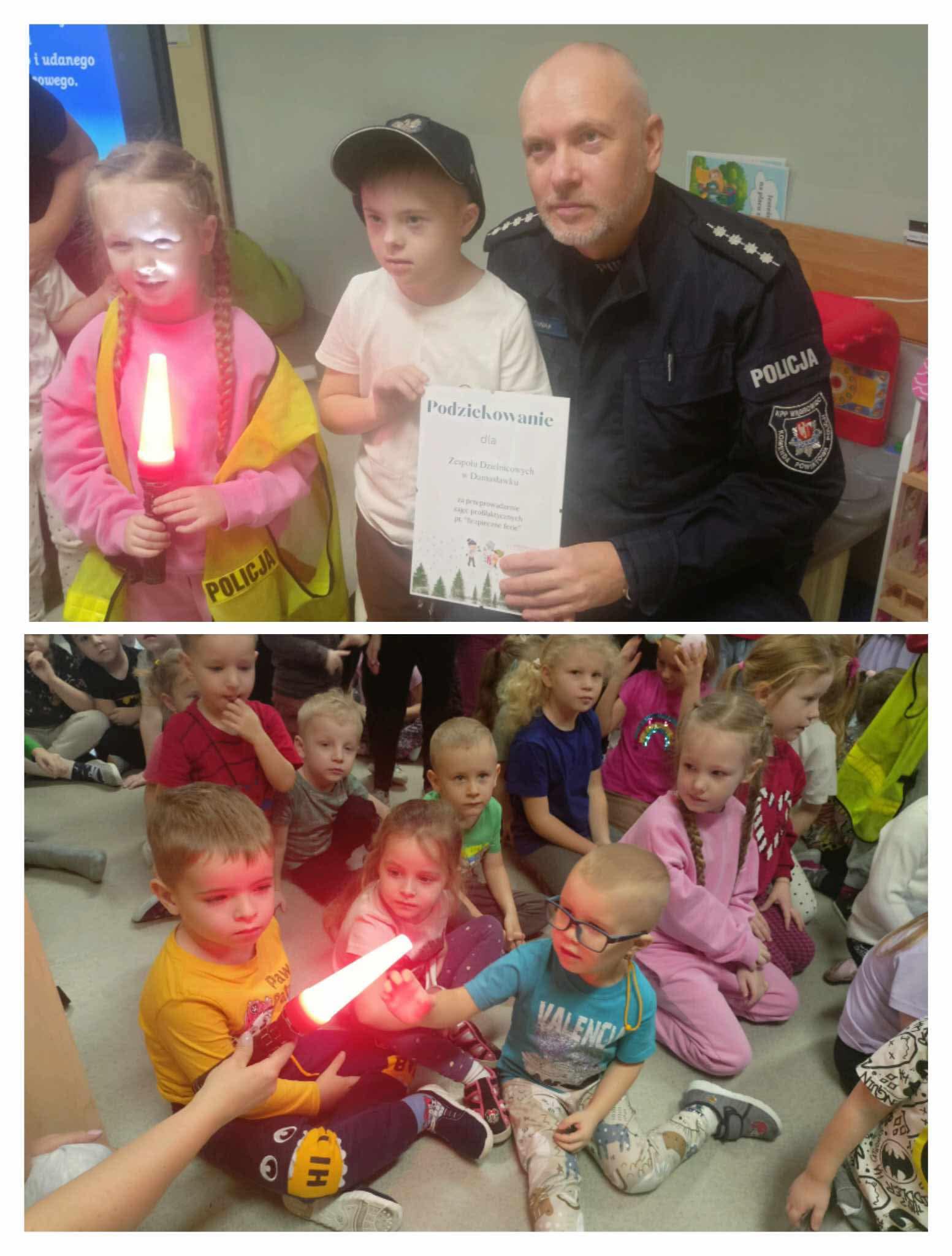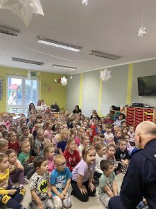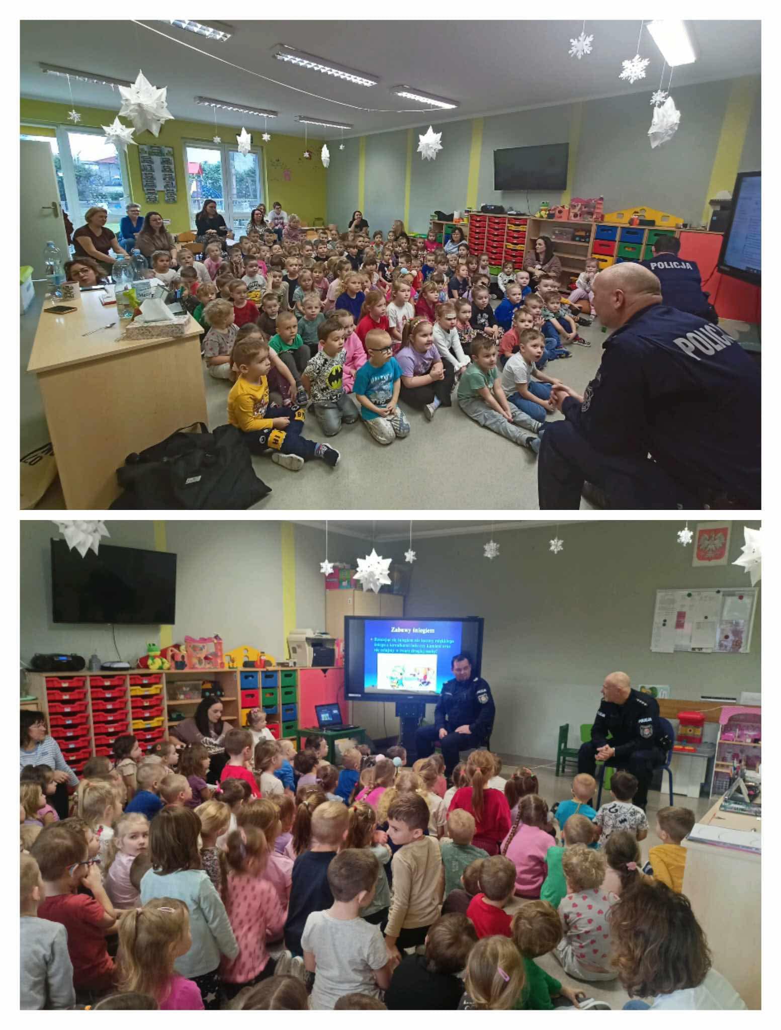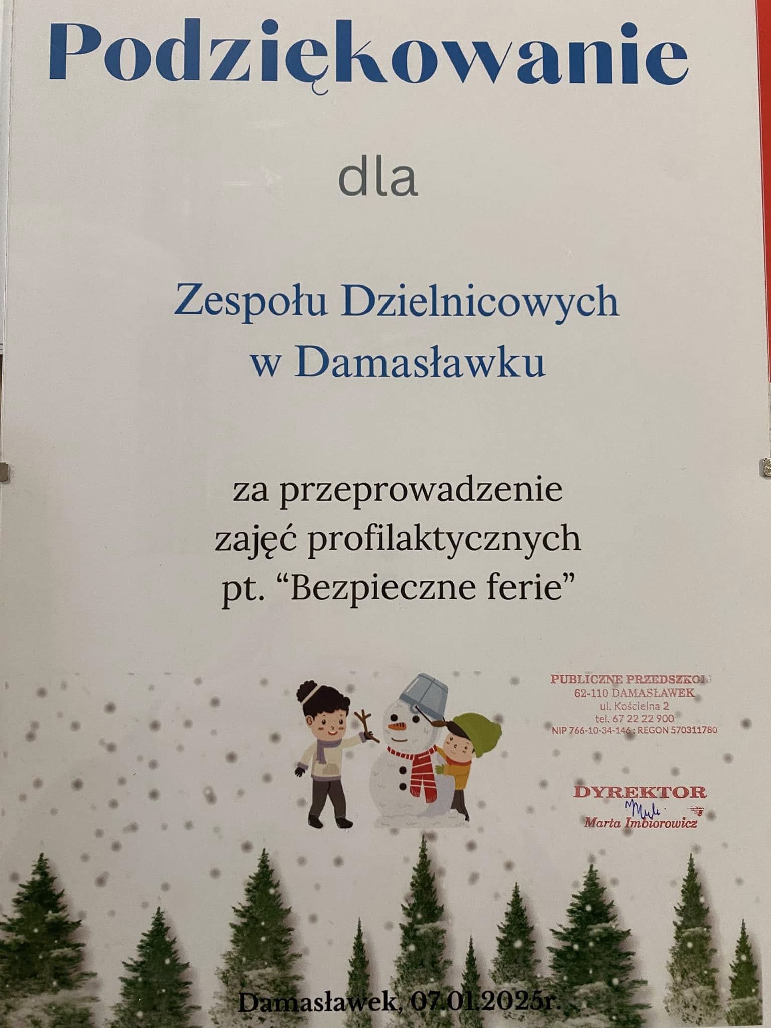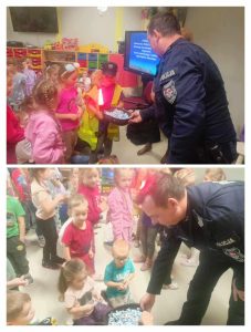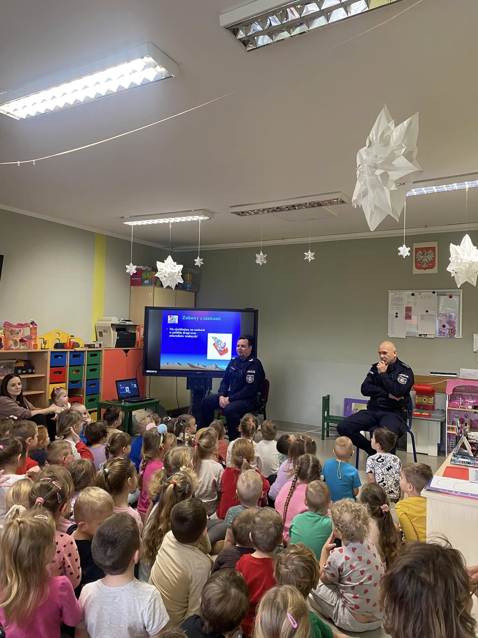 Dbając o bezpieczeństwo naszych przedszkolaków w czasie zbliżających się ferii zimowych, dnia 7 stycznia 2025 roku przedszkolaki z Damasławka i Niemczyna odwiedzili Panowie policjanci, asp. sztab. Dariusz Nowak oraz sierż. sztab. Paweł Kosmowski. Podczas spotkania profilaktyczno – edukacyjnego policjanci przypomnieli o zagrożeniach mogących pojawić się w trakcie ferii. Szczególnie skupili się na omówieniu zasad bezpieczeństwa podczas zabaw na świeżym powietrzu oraz zasad poruszania się po drogach.