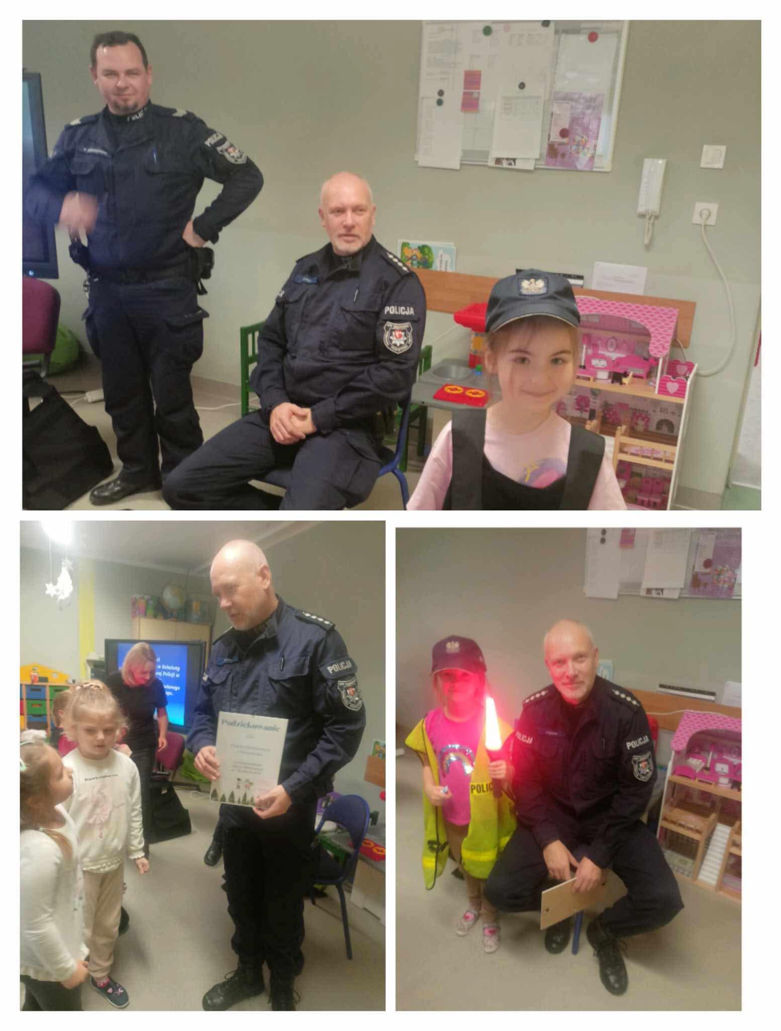 Ważnym elementem spotkania było także utrwalenie numerów alarmowych. Dużą atrakcją dla przedszkolaków było przymierzenie policyjnej czapki, kamizelki odblaskowej i kuloodpornej oraz obejrzenie policyjnego lizaka i latarki. Serdecznie dziękujemy Panom policjantom za odwiedzenie naszego przedszkola i przeprowadzenie zajęć na temat bezpiecznych ferii zimowych