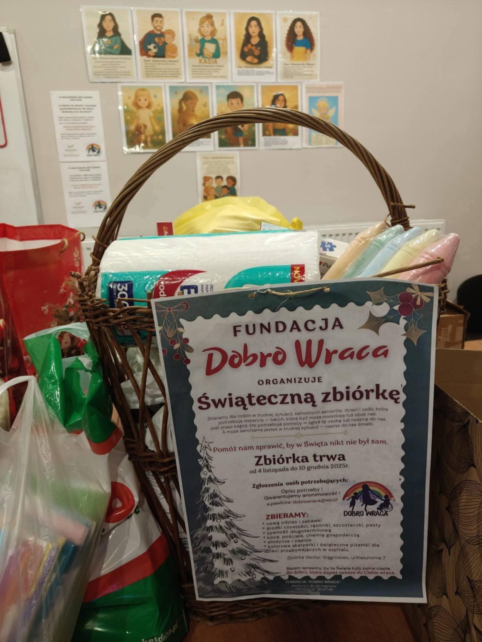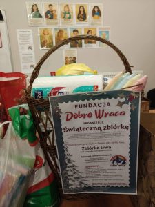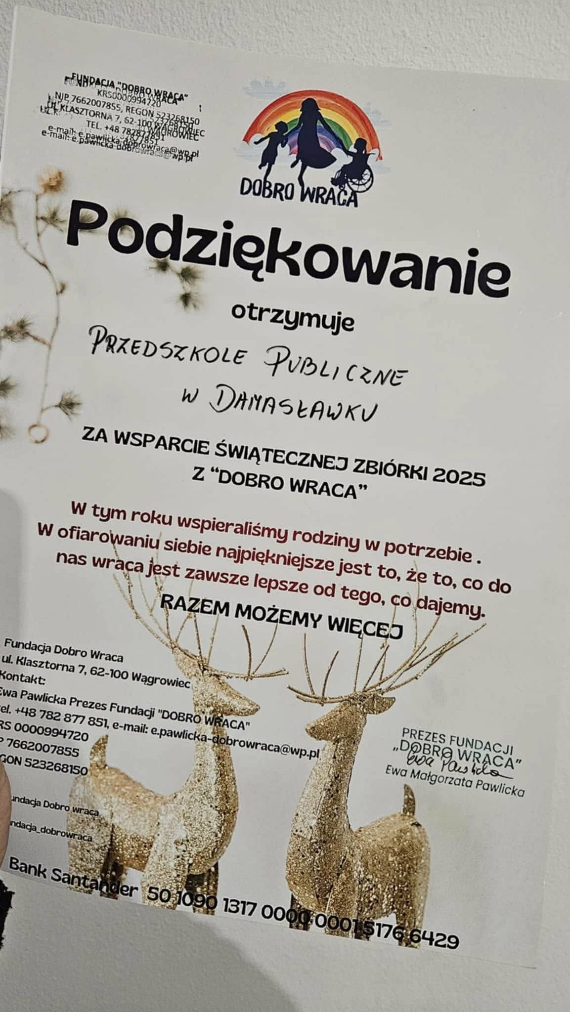 Fundację ” Dobro Wraca”, której prezesem jest pani Ewa Małgorzata Pawlicka. Inicjatorką akcji w naszym przedszkolu była pani Dorota Waszkowiak – przedstawicielka Rady Rodziców. Bardzo dziękujemy za pobudzenie naszych serc do pomagania. Mamy nadzieję, że zebrane dary sprawią że nadchodzące Święta Bożego Narodzenia będą jeszcze radośniejsza, piękniejsze i lżejsze od wszelkich trosk.