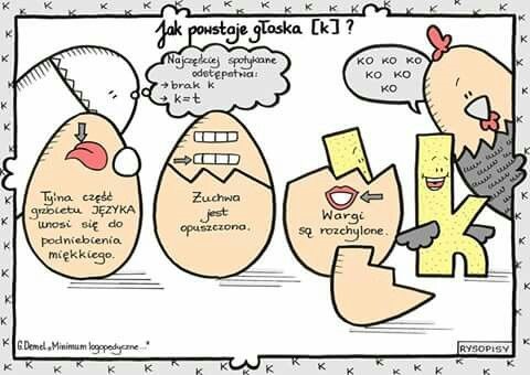 - Zobaczcie teraz , jak powstaje głoska k, jak się ją wymawia. Poproście Rodziców aby Wam odczytali poszczególne informacje i spróbujcie przy lusterku wymawiać prawidłowo głoskę „k”.