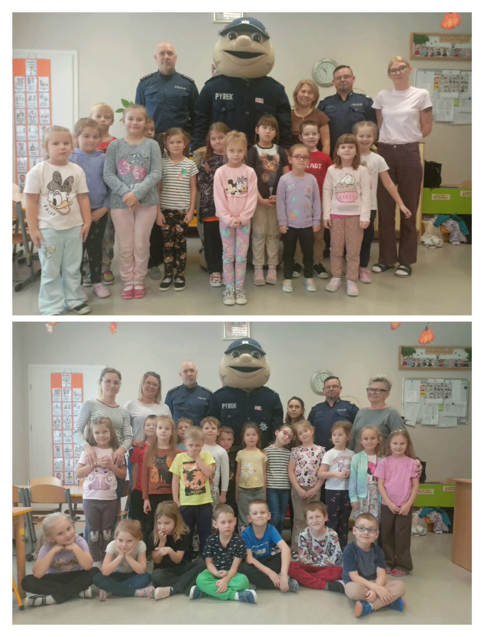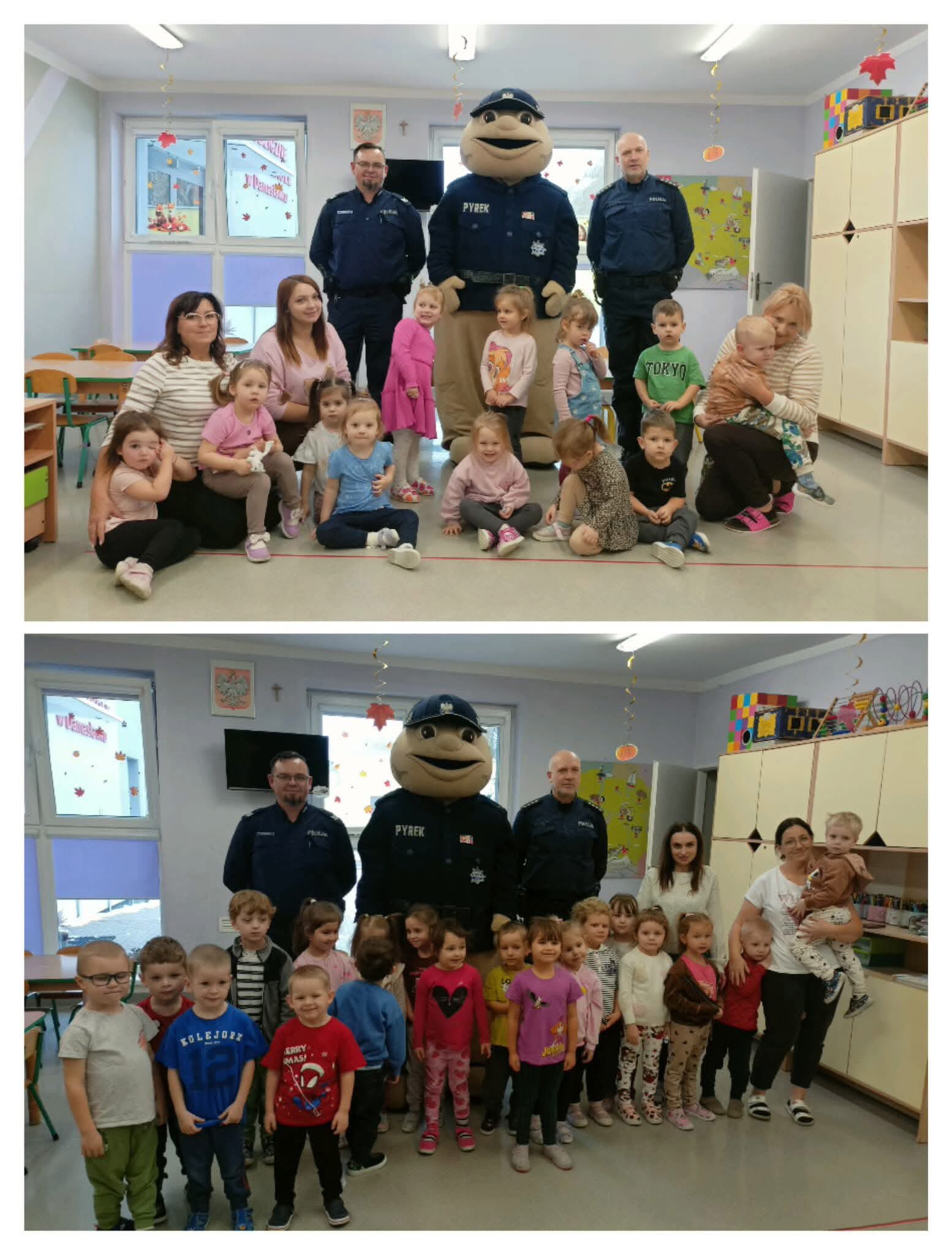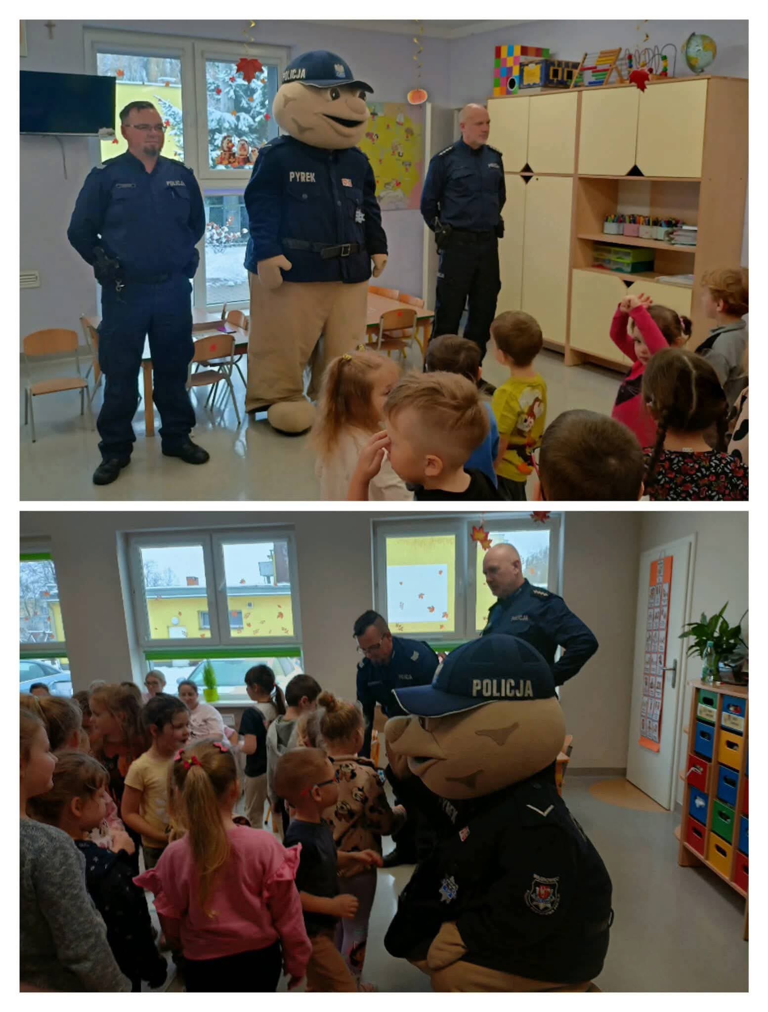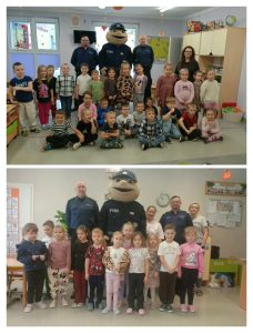 Dbając o bezpieczeństwo przedszkolaków 26 listopada nasze przedszkole w Damasławku i Niemczynie odwiedzili Panowie policjanci, asp. sztab. Dariusz Nowak, sierż. sztab. Paweł Kosmowski oraz st. post. Patryk Górny. Była to doskonała okazja, aby poprzez zabawę przypomnieć dzieciom zasady bezpiecznej zabawy na śniegu. Dużą atrakcją dla przedszkolaków było spotkanie z maskotką sierżantem Pyrkiem.