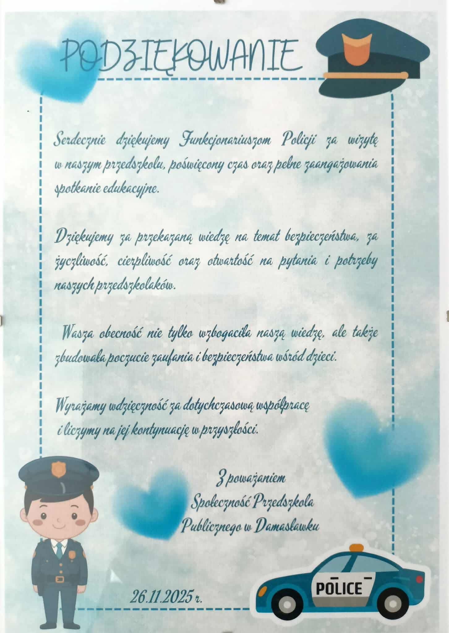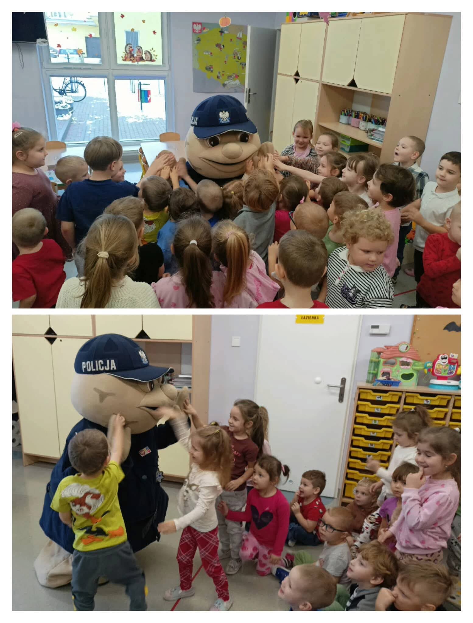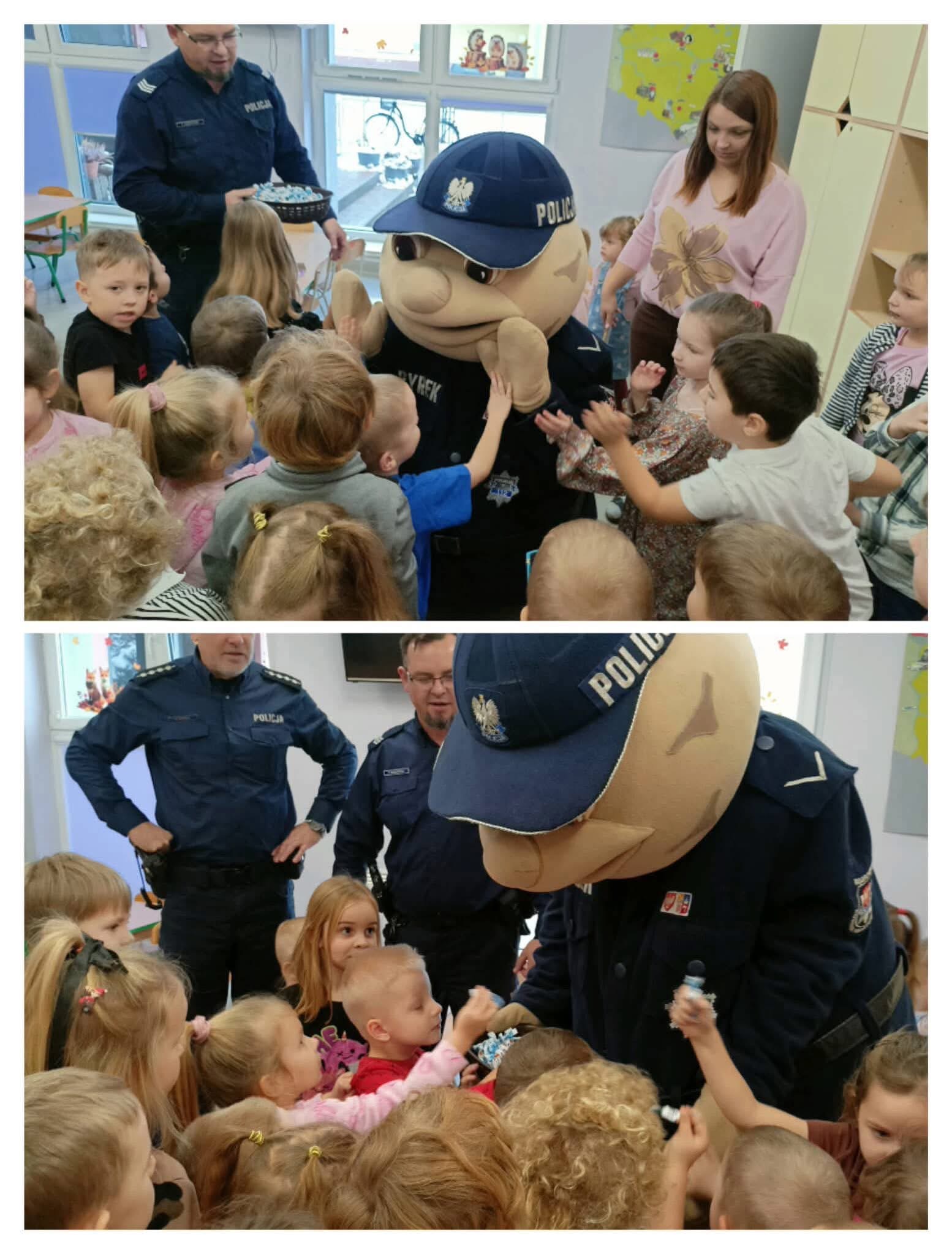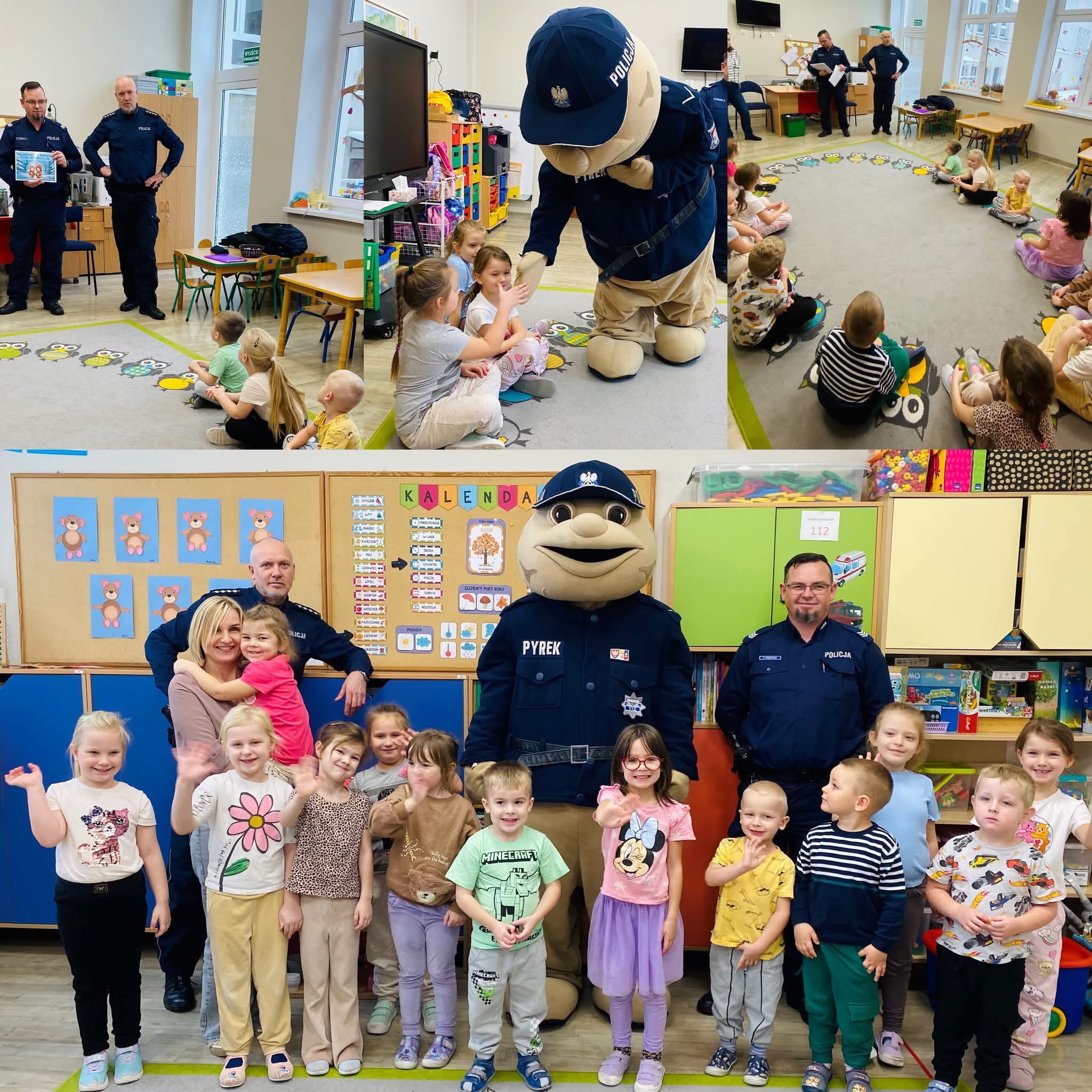 Dbając o bezpieczeństwo przedszkolaków 26 listopada nasze przedszkole w Damasławku i Niemczynie odwiedzili Panowie policjanci, asp. sztab. Dariusz Nowak, sierż. sztab. Paweł Kosmowski oraz st. post. Patryk Górny. Była to doskonała okazja, aby poprzez zabawę przypomnieć dzieciom zasady bezpiecznej zabawy na śniegu. Dużą atrakcją dla przedszkolaków było spotkanie z maskotką sierżantem Pyrkiem.