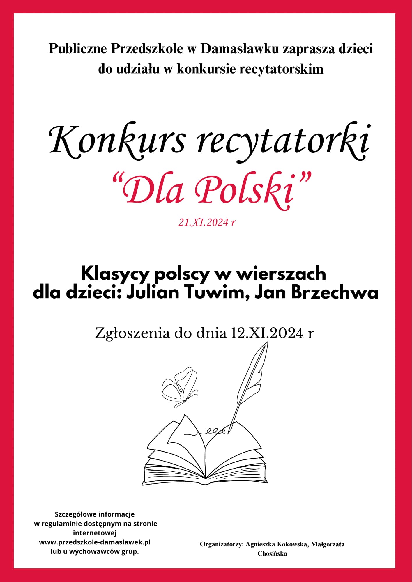 Zachęcamy do wzięcia udziału w kolejnej edycji Konkursu Recytatorskiego „Dla Polski”. W tym roku motywem przewodnim będą wiersze dla dzieci Juliana Tuwima oraz Jana Brzechwy. Wszystkie szczegóły zawiera regulamin.