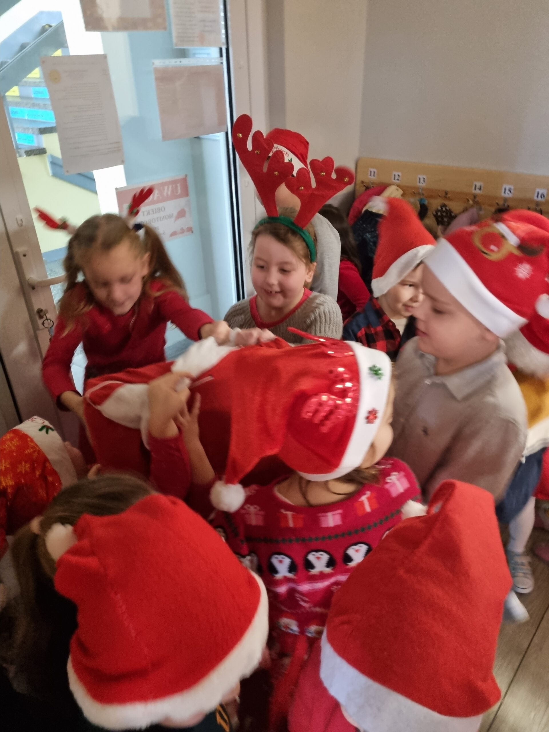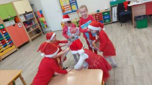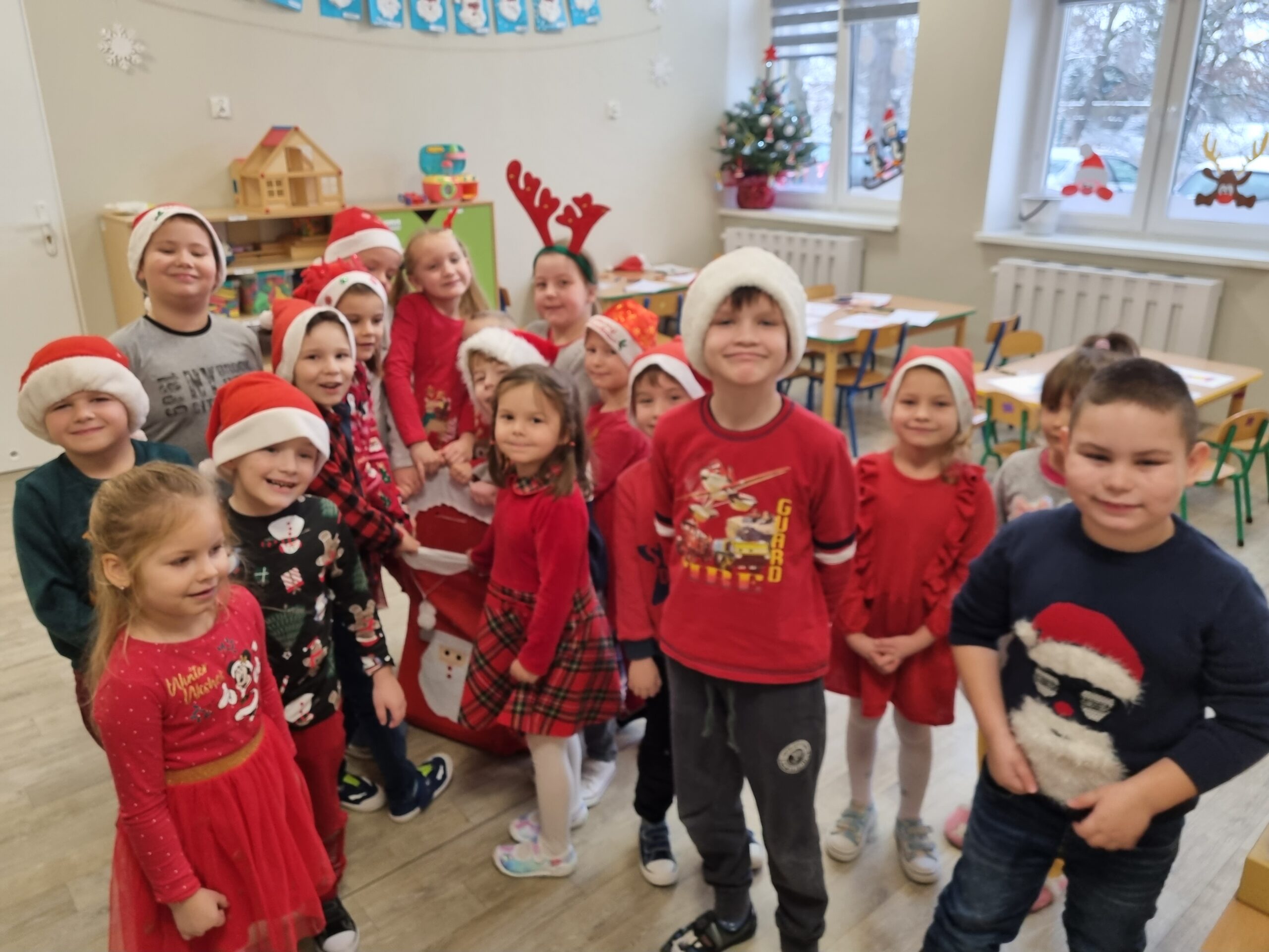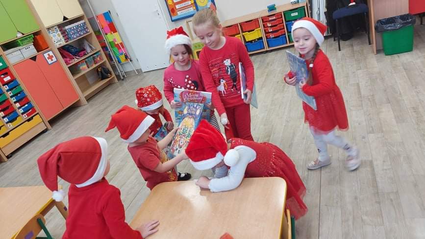 6 grudnia nasze przedszkole odwiedził długo wyczekiwany gość. Dzieci pięknie ubrane w czerwone stroje i czapeczki czekały na Świętego Mikołaja, niestety nie udało się go spotkać. Słoneczka i Sówki jednak nie były bardzo zawiedzione, ponieważ Mikołaj zostawił im wielki czerwony wór z prezentami. Dzieci z błyskiem w oku odbierały swoje upominki. Ten mikołajkowy dzień minął nam w miłej i radosnej atmosferze 🎅