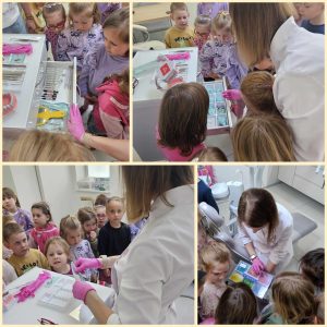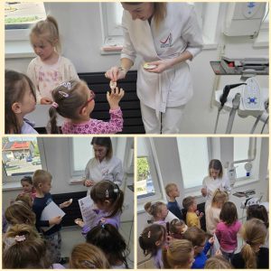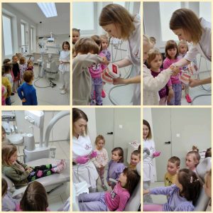z wyposażeniem gabinetu stomatologicznego, wyjaśniła jak się leczy zęby, pokazała działanie sprzętu medycznego. Pani doktor przeprowadziła pogadankę na temat prawidłowego mycia zębów na zestawie „dużej szczęki”, a także pozwoliła,by każde dziecko mogło usiąść na fotelu,na którym pani stomatolog leczy zęby. Na koniec wizyty dzieci otrzymały drobny upominek, za który serdecznie dziękujemy.