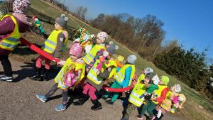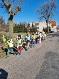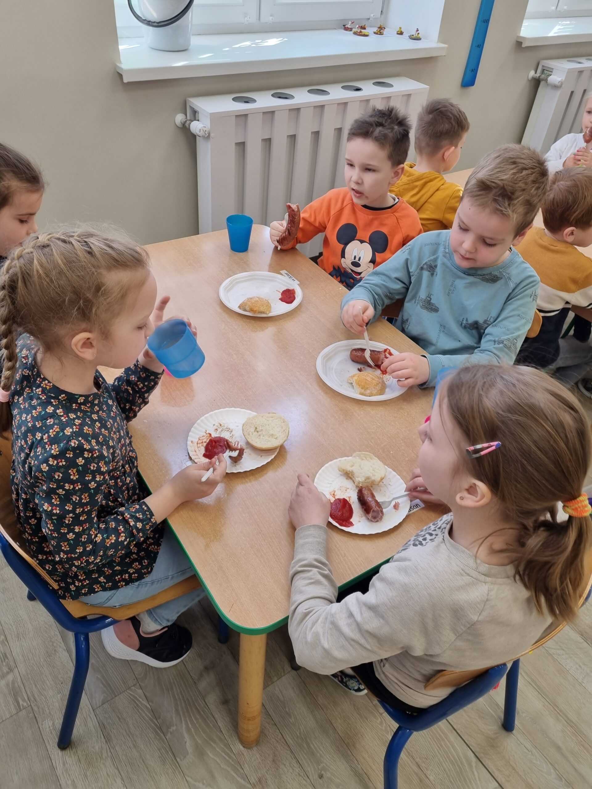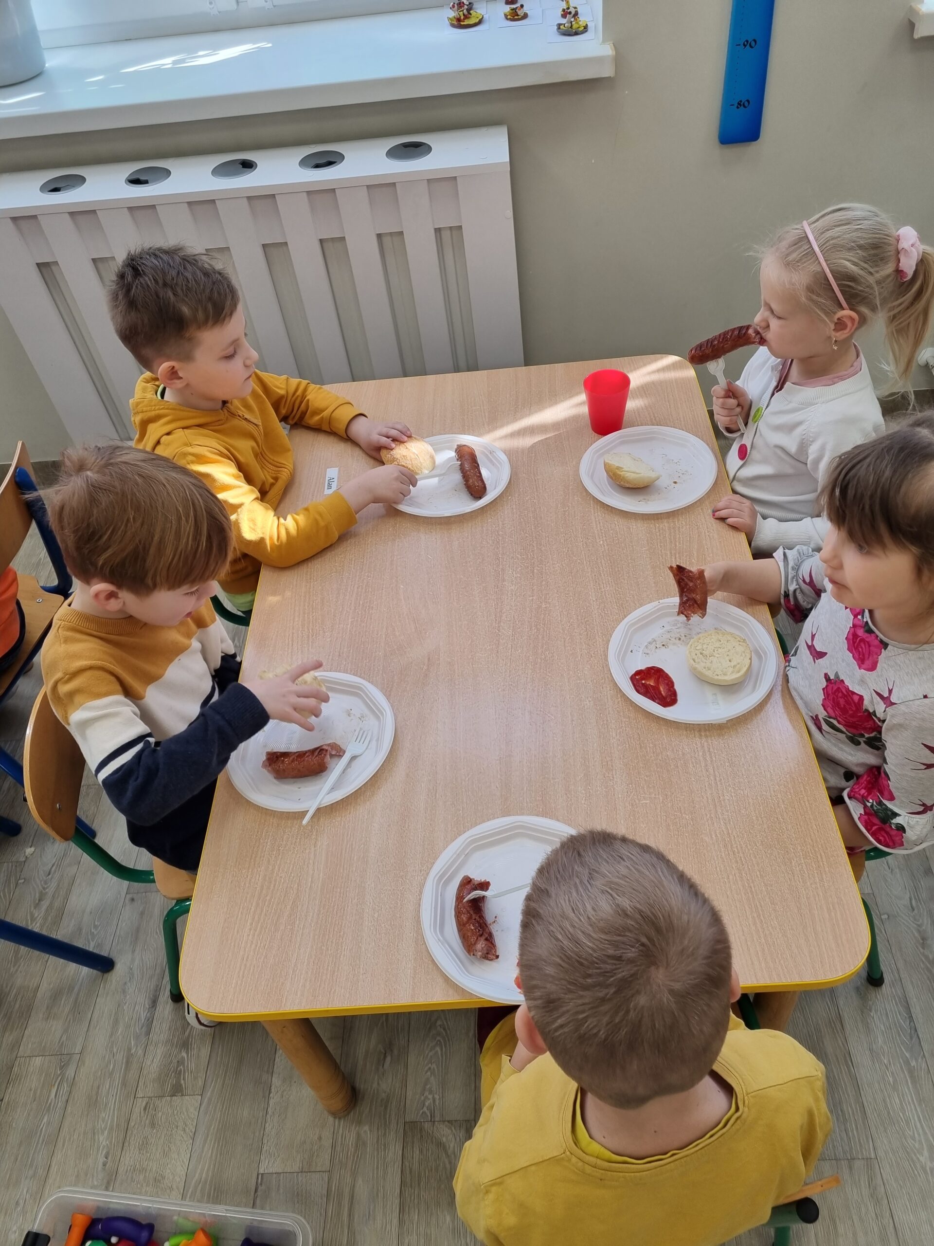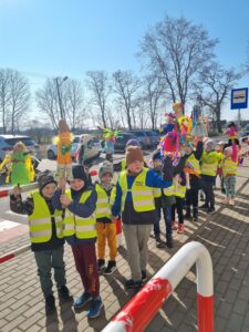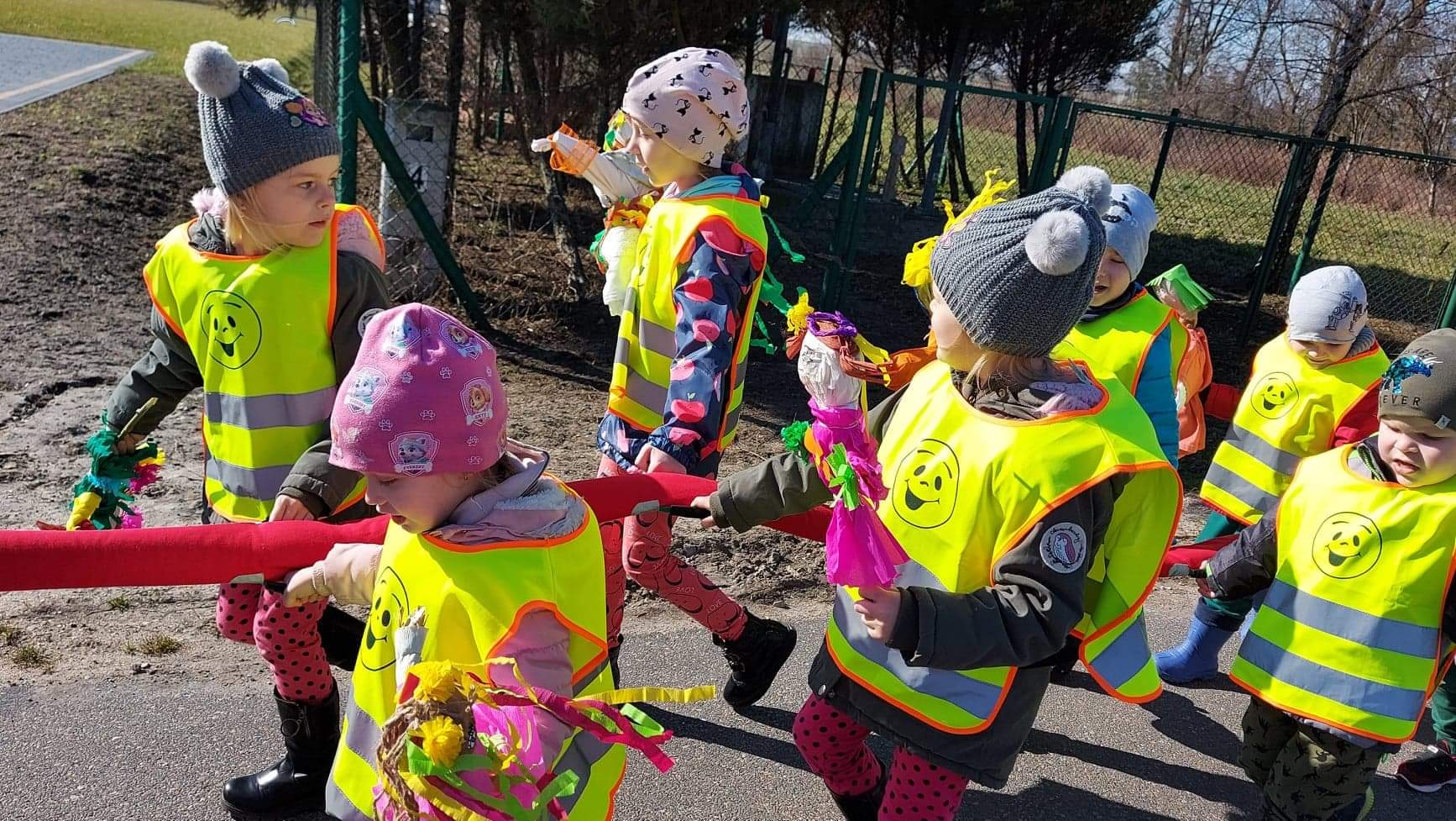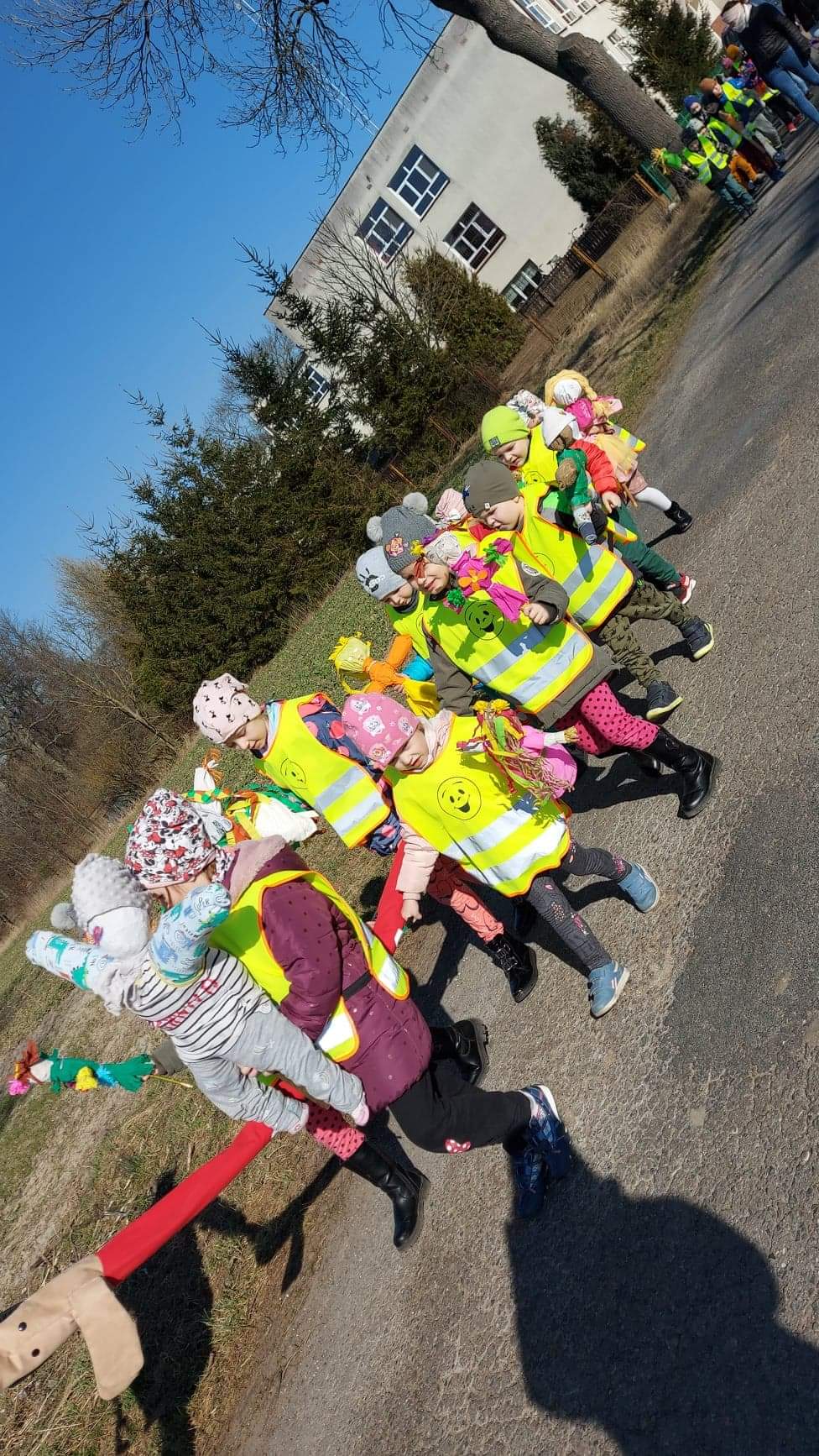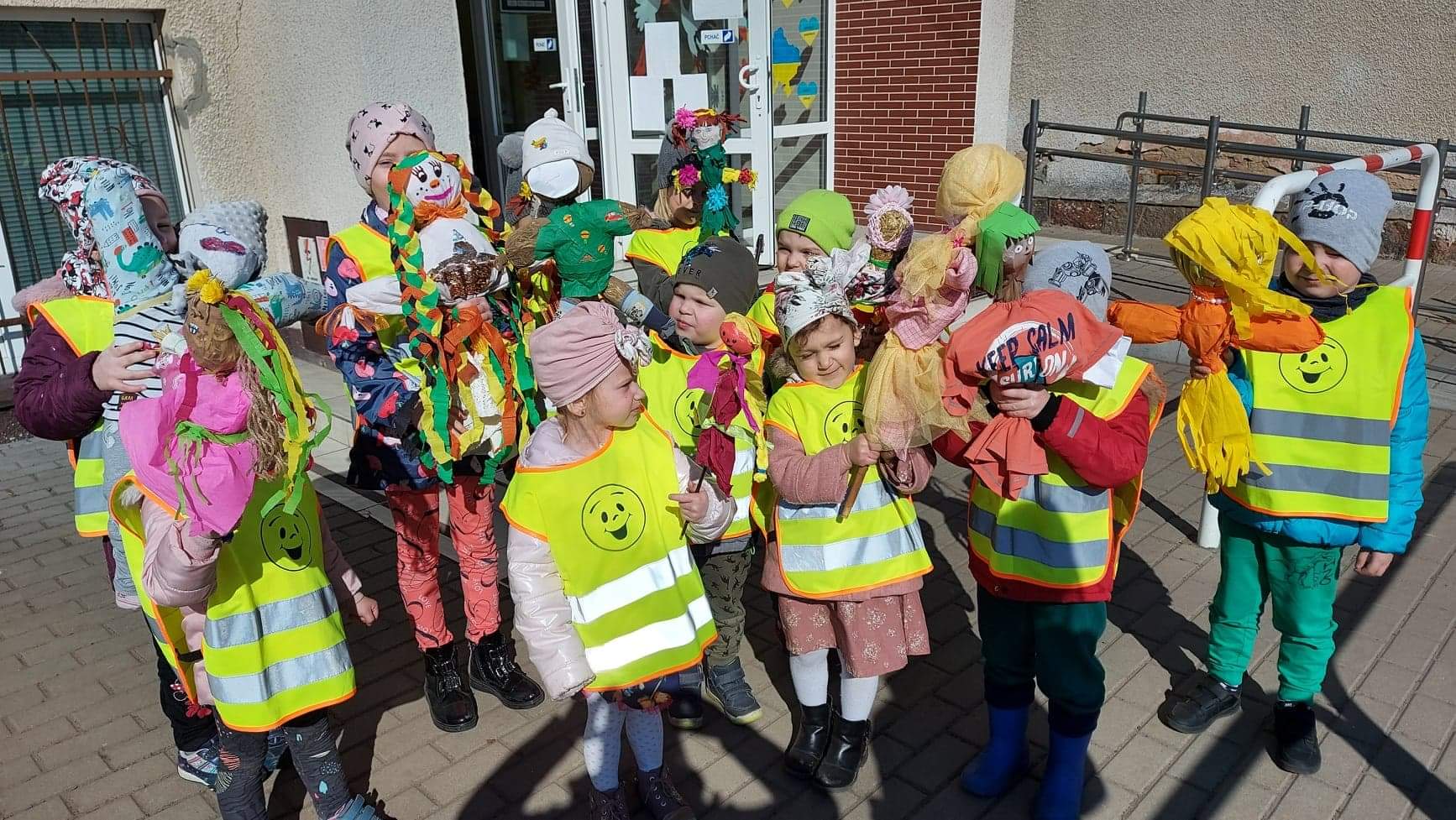 Dzisiaj w przedszkolu dzieci przyszły ubrane w wiosenne kolory. Wspólnie rozwiązywaliśmy zagadki i uczestniczyliśmy w zabawach ruchowych. Następnie wyruszyliśmy barwnym korowodem trzymając w ręku Marzanny. W ten sposób chcieliśmy wyrazić radość z nadejścia WIOSNY. Marzanny zostały uroczyście pożegnane. Na zakończenie jedliśmy smaczne kiełbaski.