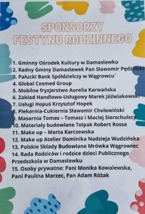 Dziękujemy wszystkim sponsorom, którzy dołożyli cegiełkę do Festynu Rodzinnego! „Dobre drzewo, dobrym owocem się okrywa, dobry człek z dobrych czynów poznawany bywa.” Wacław Potocki” Podziękowanie dla sponsorów