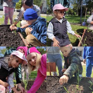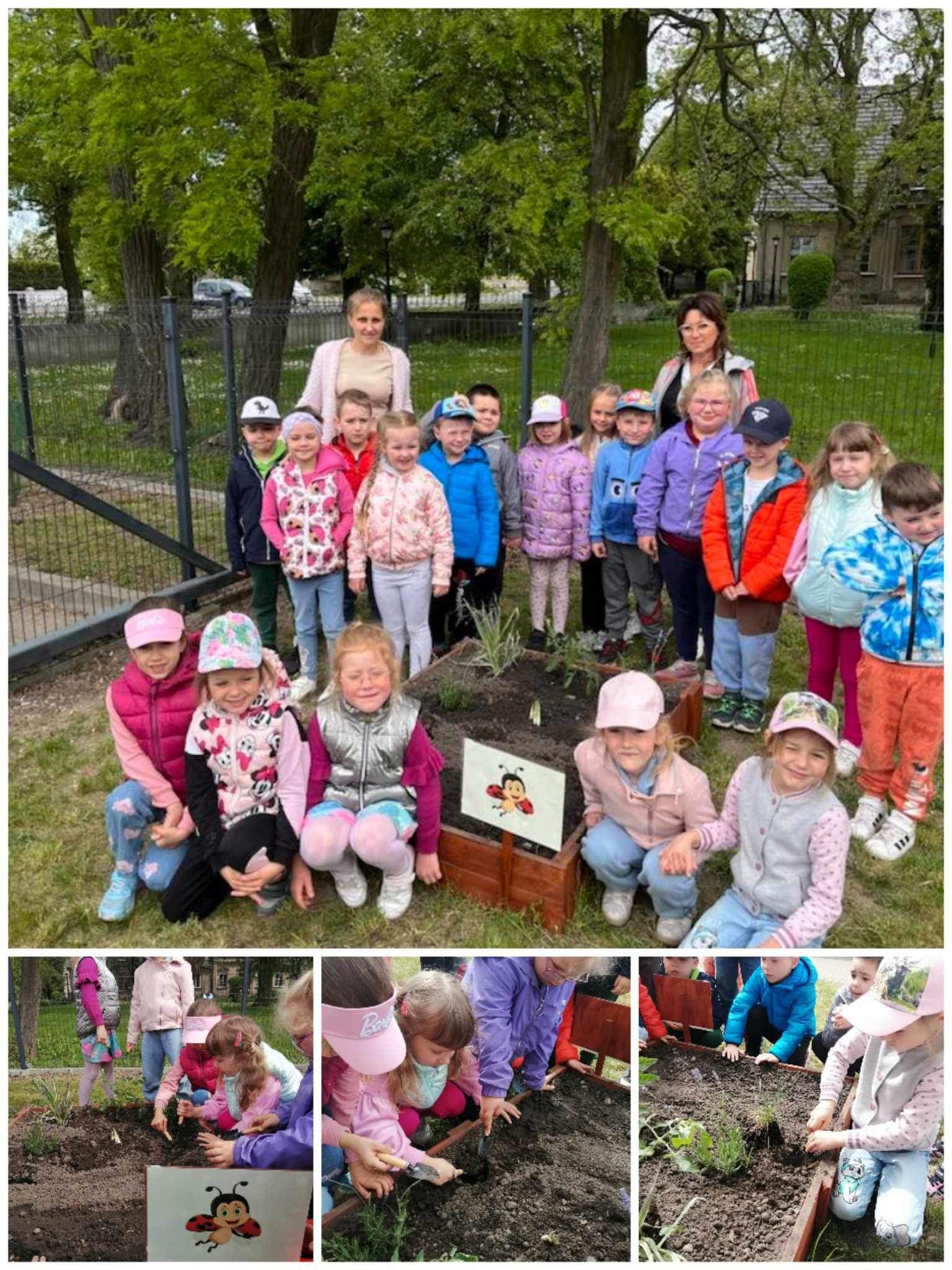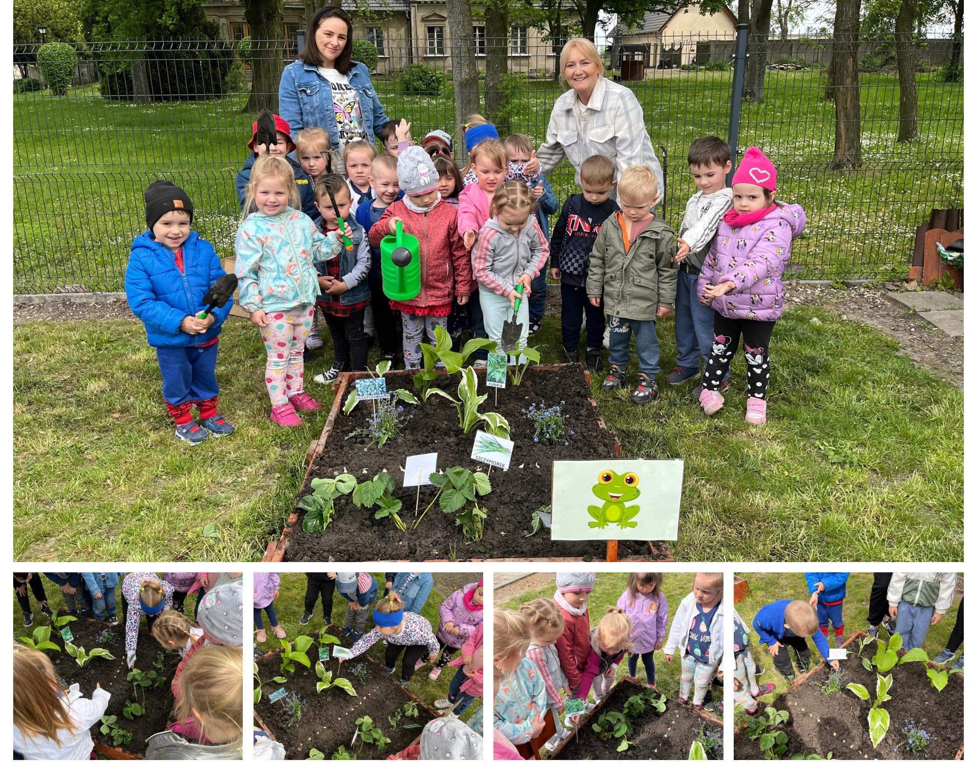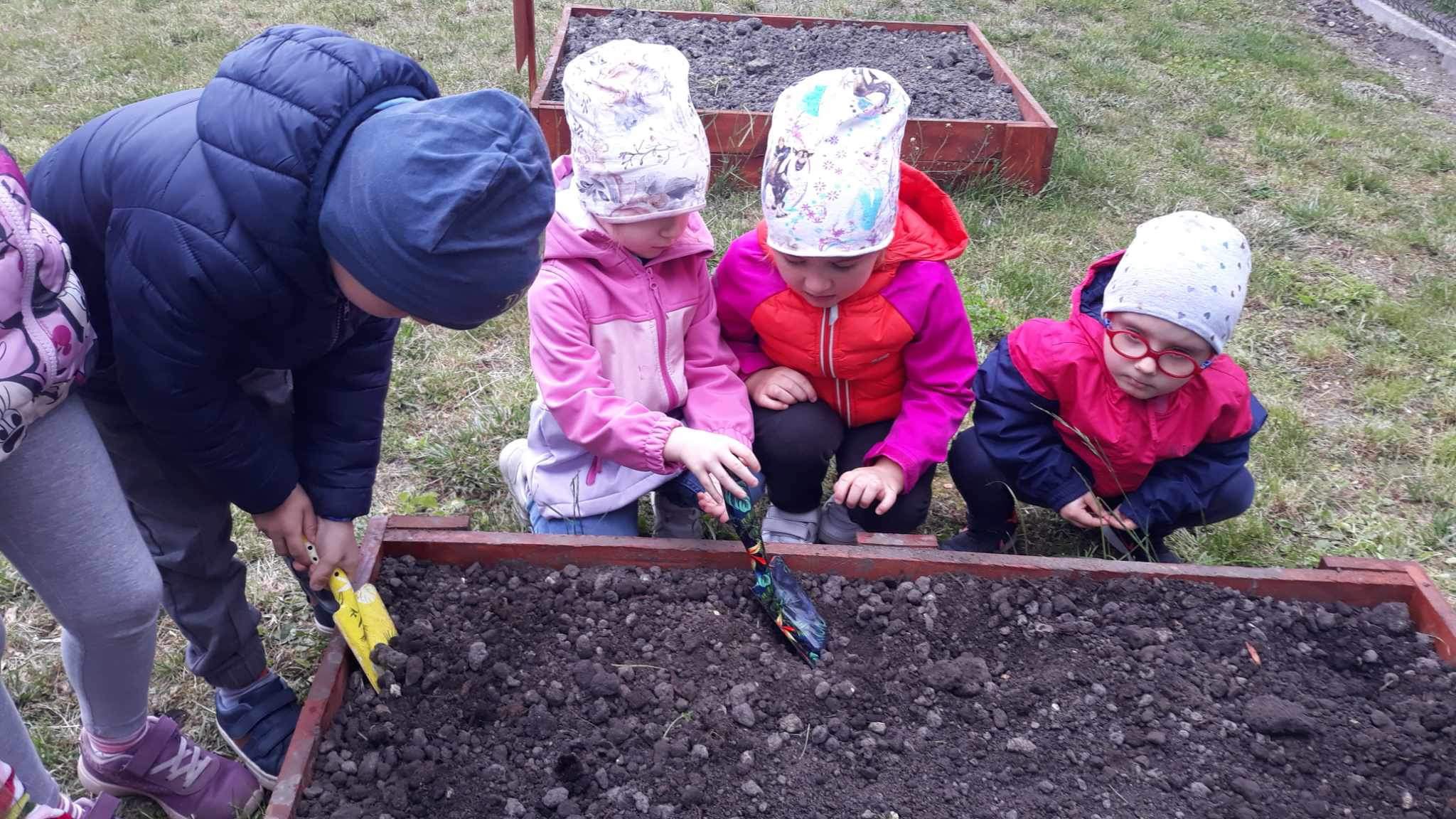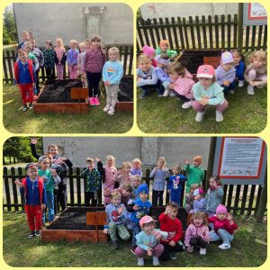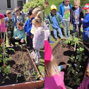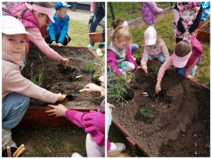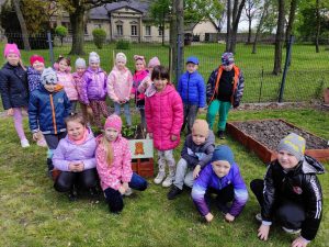 Już od wczesnej wiosny poprzez szereg różnorodnych zajęć teoretycznych i praktycznych nasze przedszkolaki pogłębiały wiedzę i przekonanie o zaletach zdrowego odżywiania. Te cenne informacje i wiadomości dotyczące zdrowego trybu życia i odżywiania, a przekazywane w atrakcyjnej dla dzieci formie, zachęciły nas do założenia własnego ogródka z wartościowymi dla organizmu roślinkami. Najpierw był to zielony ogródek w salach. Znalazły się w nim nowalijki w postaci rzeżuchy czy szczypiorku oraz pierwsze wiosenne kwiatki. Jednak rozsmakowaliśmy się w pracach ogrodniczych i wspólnie zaprojektowaliśmy ogródek warzywny. W tym celu podczas spacerów obserwowaliśmy i przyglądaliśmy się ogrodom przydomowym i działkowym. Poznawaliśmy rośliny i narzędzia ogrodnicze, konieczne przy uprawie roślin. Nie pozostało nam nic innego jak skorzystać z tych rad i już niedługo będziemy się cieszyć ze wspaniałego wzrostu naszych własnoręcznie zasianych nasion. W naszym przedszkolnym ogródku warzywnym rosną marchewki, buraczki, koperek, rzodkiewka, truskawki, słoneczniki kwiaty a my codziennie cieszymy się i dbamy by wszystko nadal pięknie rosło.