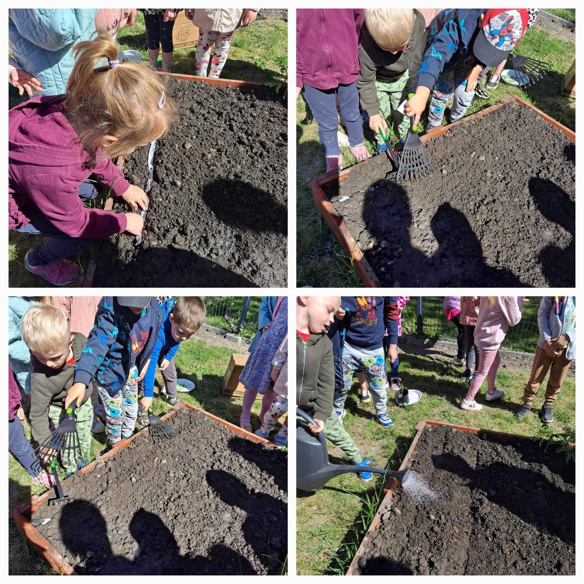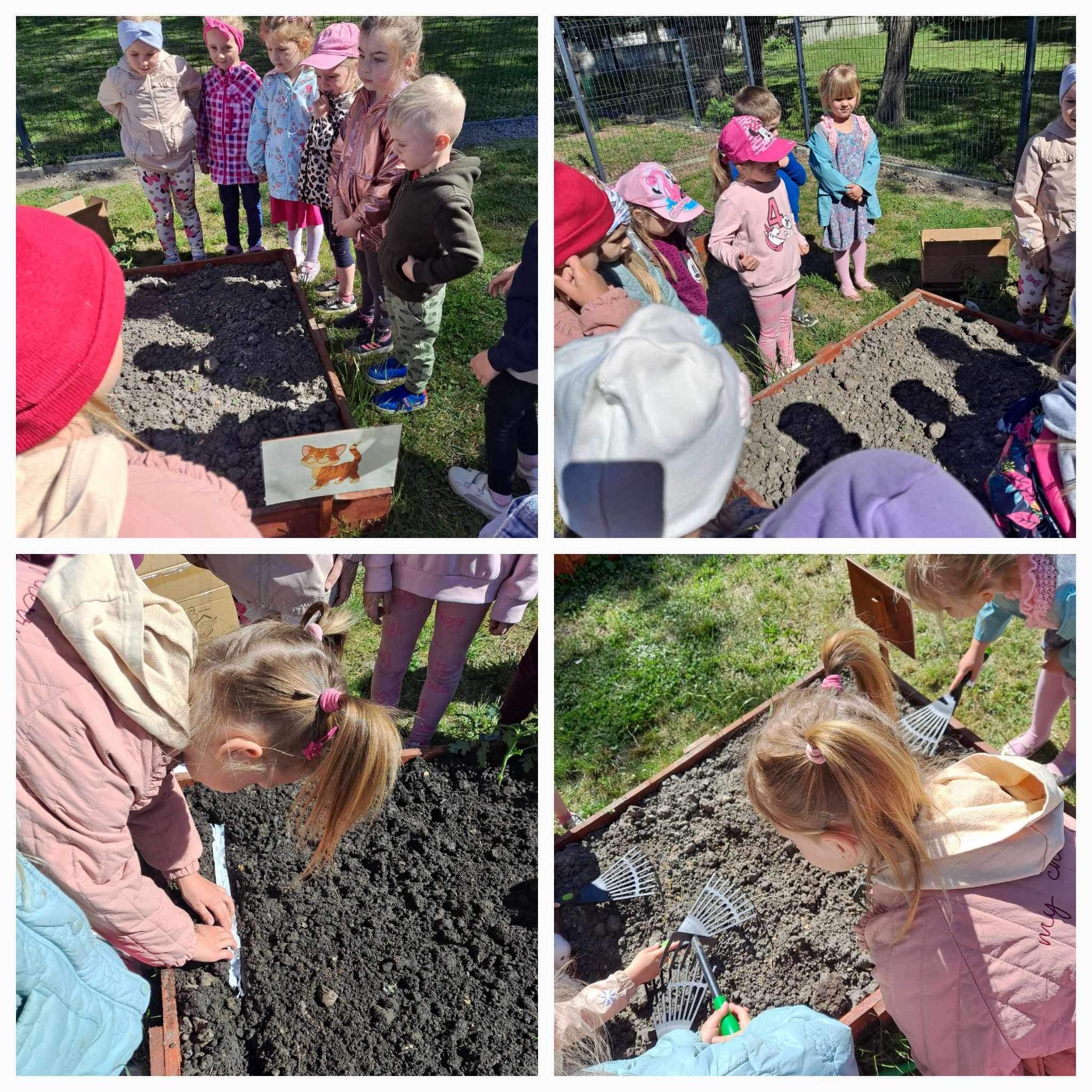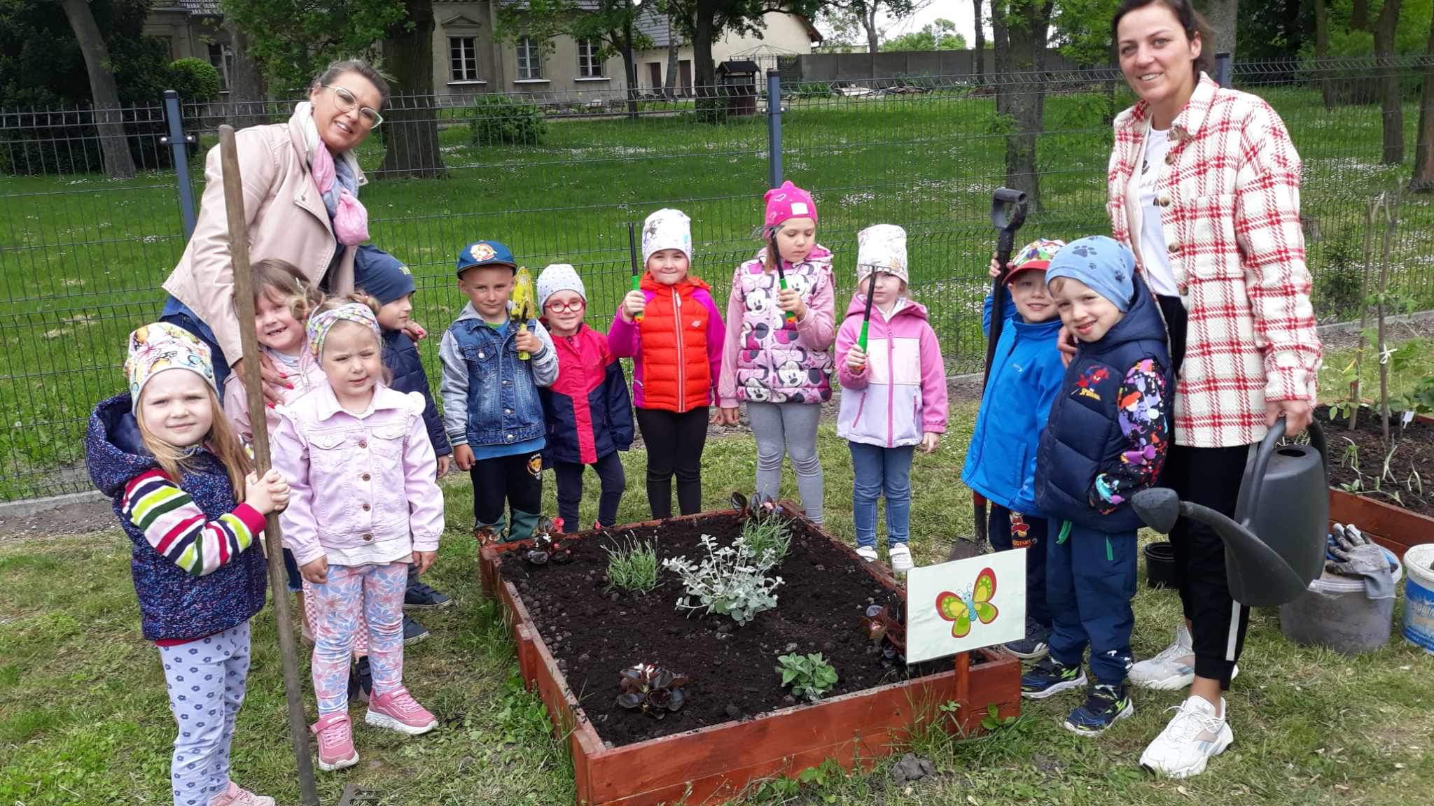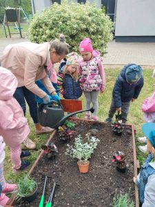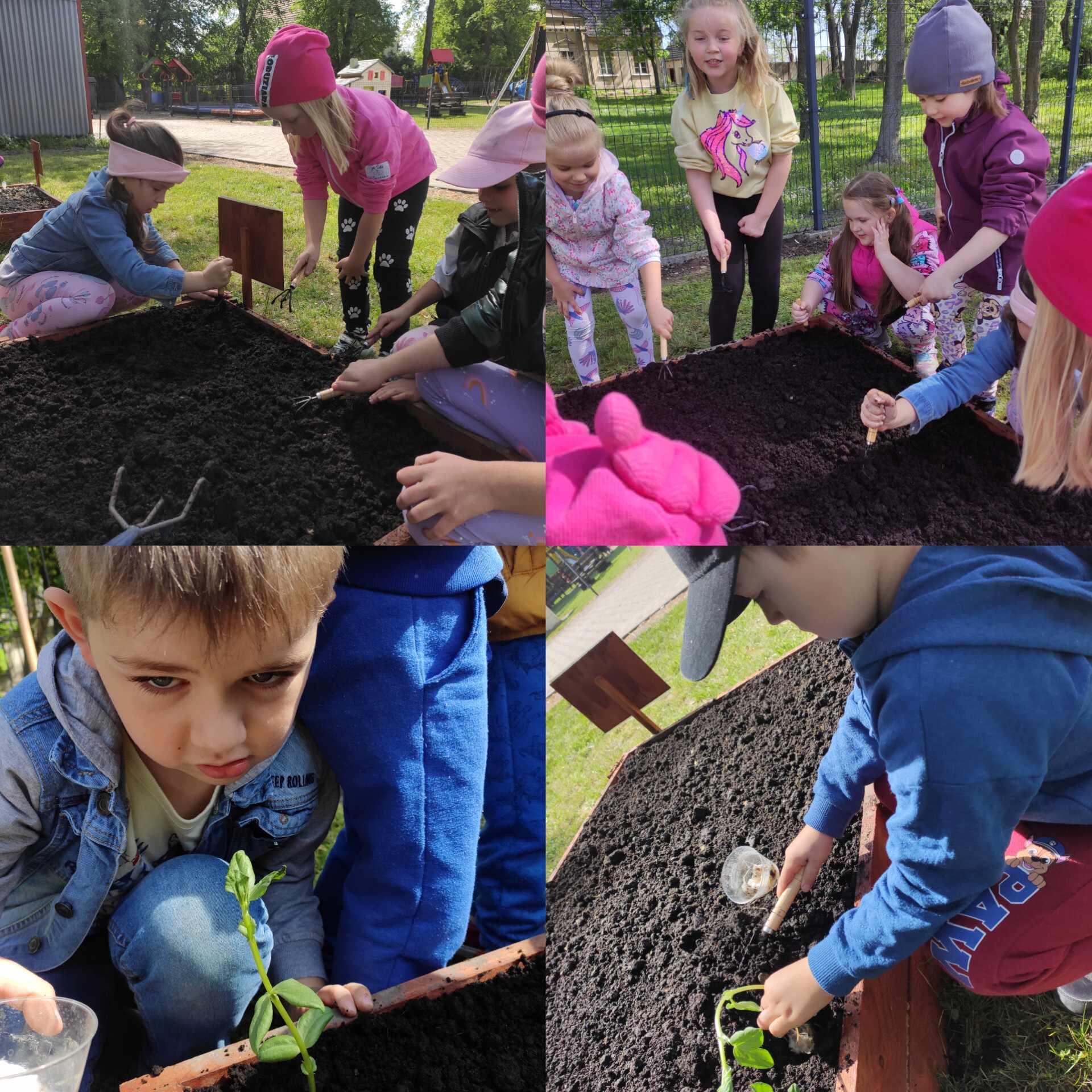 Już od wczesnej wiosny poprzez szereg różnorodnych zajęć teoretycznych i praktycznych nasze przedszkolaki pogłębiały wiedzę i przekonanie o zaletach zdrowego odżywiania. Te cenne informacje i wiadomości dotyczące zdrowego trybu życia i odżywiania, a przekazywane w atrakcyjnej dla dzieci formie, zachęciły nas do założenia własnego ogródka z wartościowymi dla organizmu roślinkami. Najpierw był to zielony ogródek w salach. Znalazły się w nim nowalijki w postaci rzeżuchy czy szczypiorku oraz pierwsze wiosenne kwiatki. Jednak rozsmakowaliśmy się w pracach ogrodniczych i wspólnie zaprojektowaliśmy ogródek warzywny. W tym celu podczas spacerów obserwowaliśmy i przyglądaliśmy się ogrodom przydomowym i działkowym. Poznawaliśmy rośliny i narzędzia ogrodnicze, konieczne przy uprawie roślin. Nie pozostało nam nic innego jak skorzystać z tych rad i już niedługo będziemy się cieszyć ze wspaniałego wzrostu naszych własnoręcznie zasianych nasion. W naszym przedszkolnym ogródku warzywnym rosną marchewki, buraczki, koperek, rzodkiewka, truskawki, słoneczniki kwiaty a my codziennie cieszymy się i dbamy by wszystko nadal pięknie rosło.