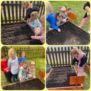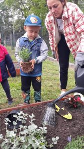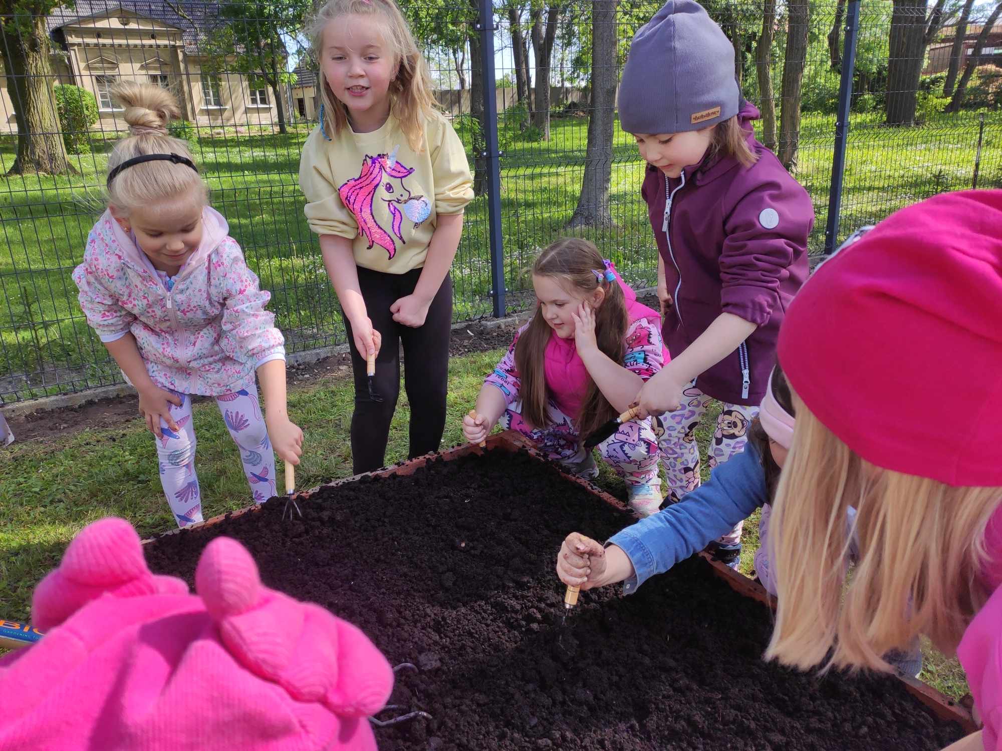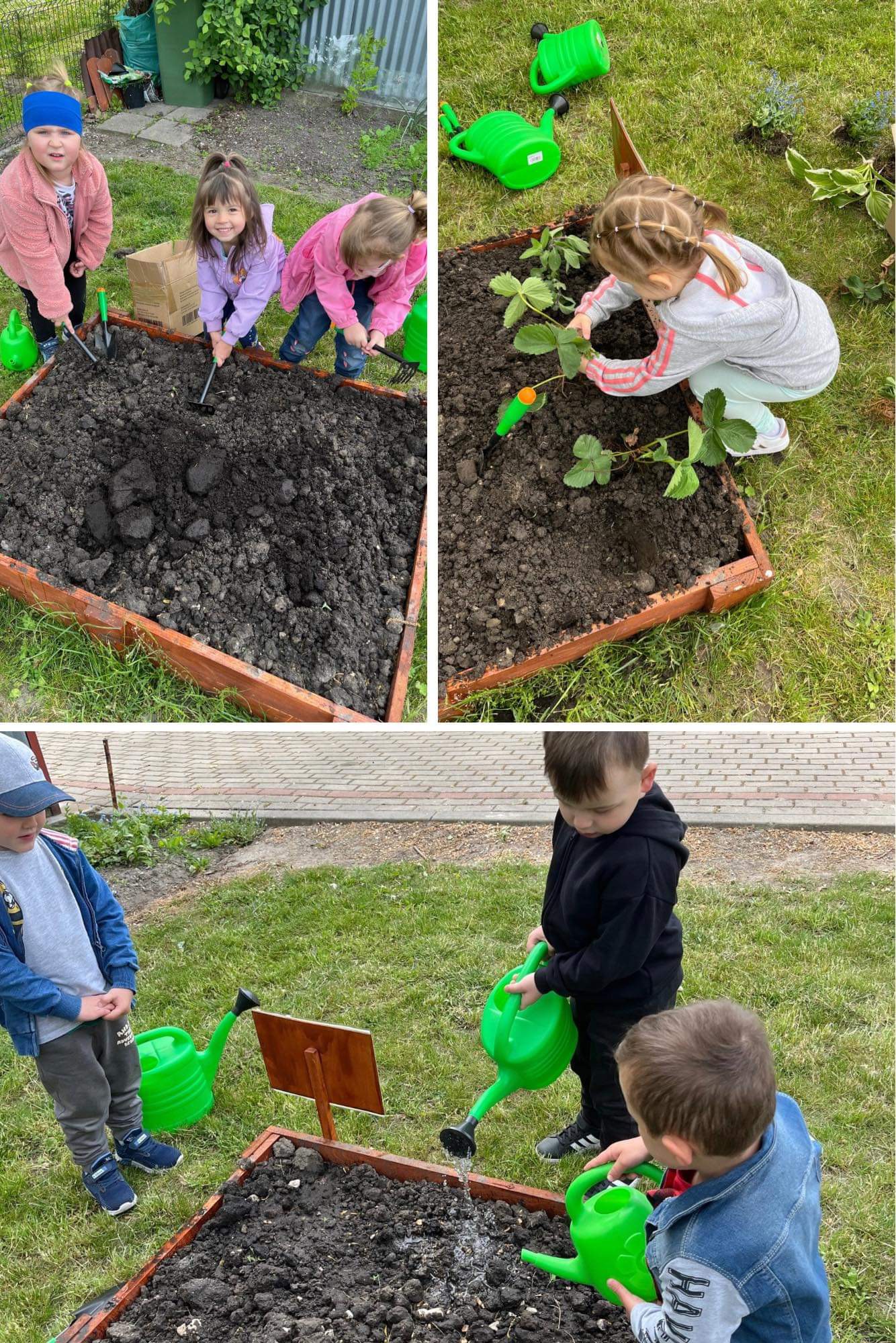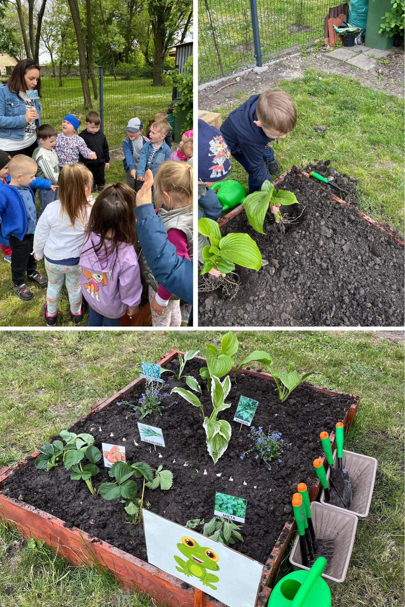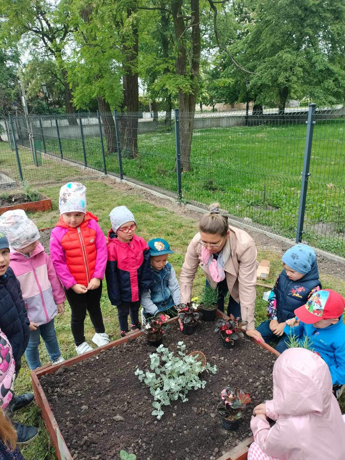 Już od wczesnej wiosny poprzez szereg różnorodnych zajęć teoretycznych i praktycznych nasze przedszkolaki pogłębiały wiedzę i przekonanie o zaletach zdrowego odżywiania. Te cenne informacje i wiadomości dotyczące zdrowego trybu życia i odżywiania, a przekazywane w atrakcyjnej dla dzieci formie, zachęciły nas do założenia własnego ogródka z wartościowymi dla organizmu roślinkami. Najpierw był to zielony ogródek w salach. Znalazły się w nim nowalijki w postaci rzeżuchy czy szczypiorku oraz pierwsze wiosenne kwiatki. Jednak rozsmakowaliśmy się w pracach ogrodniczych i wspólnie zaprojektowaliśmy ogródek warzywny. W tym celu podczas spacerów obserwowaliśmy i przyglądaliśmy się ogrodom przydomowym i działkowym. Poznawaliśmy rośliny i narzędzia ogrodnicze, konieczne przy uprawie roślin. Nie pozostało nam nic innego jak skorzystać z tych rad i już niedługo będziemy się cieszyć ze wspaniałego wzrostu naszych własnoręcznie zasianych nasion. W naszym przedszkolnym ogródku warzywnym rosną marchewki, buraczki, koperek, rzodkiewka, truskawki, słoneczniki kwiaty a my codziennie cieszymy się i dbamy by wszystko nadal pięknie rosło.