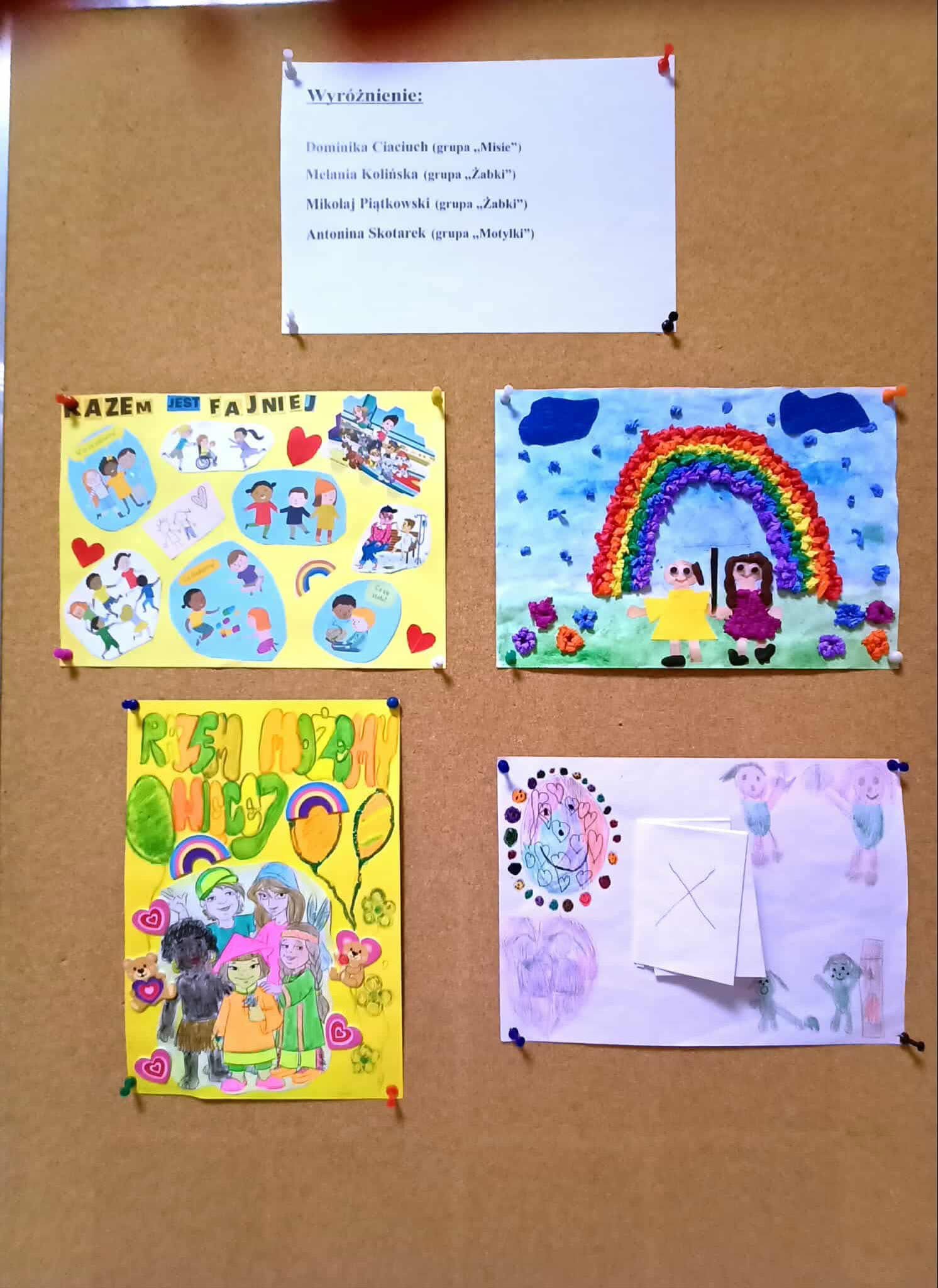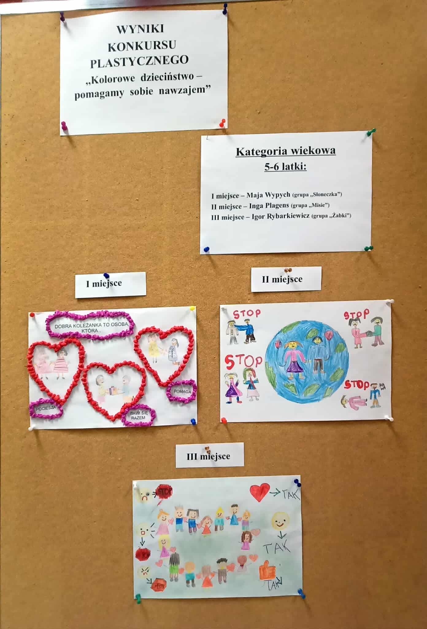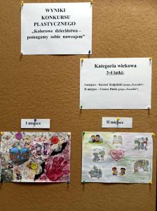 W ramach ogólnopolskiej kampanii ,,Dzieciństwo bez Przemocy”, która realizowana jest w Publicznym Przedszkolu w Damasławku Panie psycholog przedszkolny i pedagog specjalny zorganizowały konkurs plastyczny pt. ,,Kolorowe dzieciństwo – pomagamy sobie nawzajem”. Konkurs został rozstrzygnięty w poniedziałek, dnia 17 listopada. Do udziału w konkursie wpłynęło 21 prac plastycznych (2 prace w kategorii wiekowej 3-4 latki oraz 19 prac w kategorii wiekowej 5-6 latki). Jury w składzie: dyrektor Publicznego Przedszkola w Damasławku, Pani Marta Imbiorowicz, psycholog przedszkolny, Pani Paulina Wekwert oraz sekretarka Pani Aleksandra Genke miało bardzo trudne zadanie do wykonania. Wszystkie prace były piękne, zachwycały kreatywnością, pomysłowością i wyobraźnią uczestników. Po obradach komisja konkursowa wyłoniła następujących zwycięzców oraz przyznała wyróżnienia: