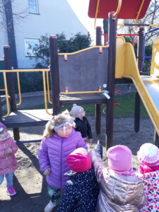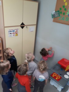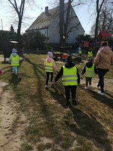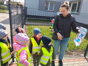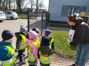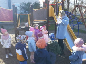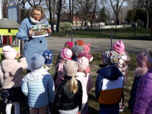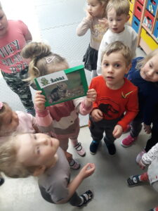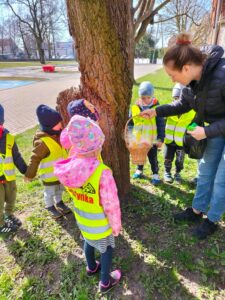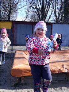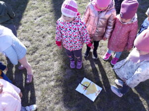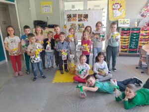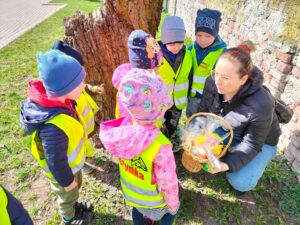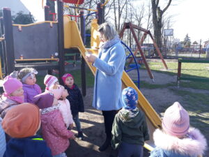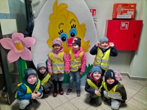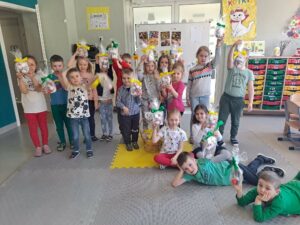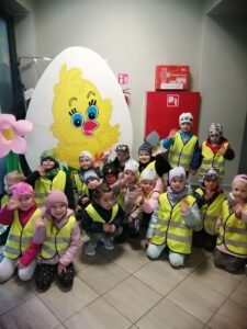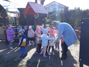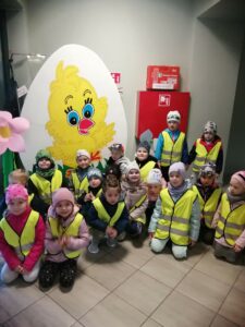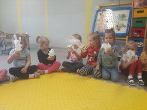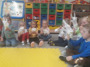 Jak co roku w okresie wielkanocnym przychodzi do naszego przedszkola zajączek Wielkanocny i w tajemniczy sposób zostawia dla wszystkich przedszkolaków koszyczki z prezentami. W tym roku zostawił również listy dla dzieci, w których ukryte były zadania do wykonania. Dzieci wykonywały z wielkim zaangażowaniem wszystkie zadania- śpiewały piosenki, recytowały wiersze. Koszyczki z niespodziankami ukryte były na terenie przedszkola. Dzieci z wielką radością szukały upominków zostawionych przez Zajączka.