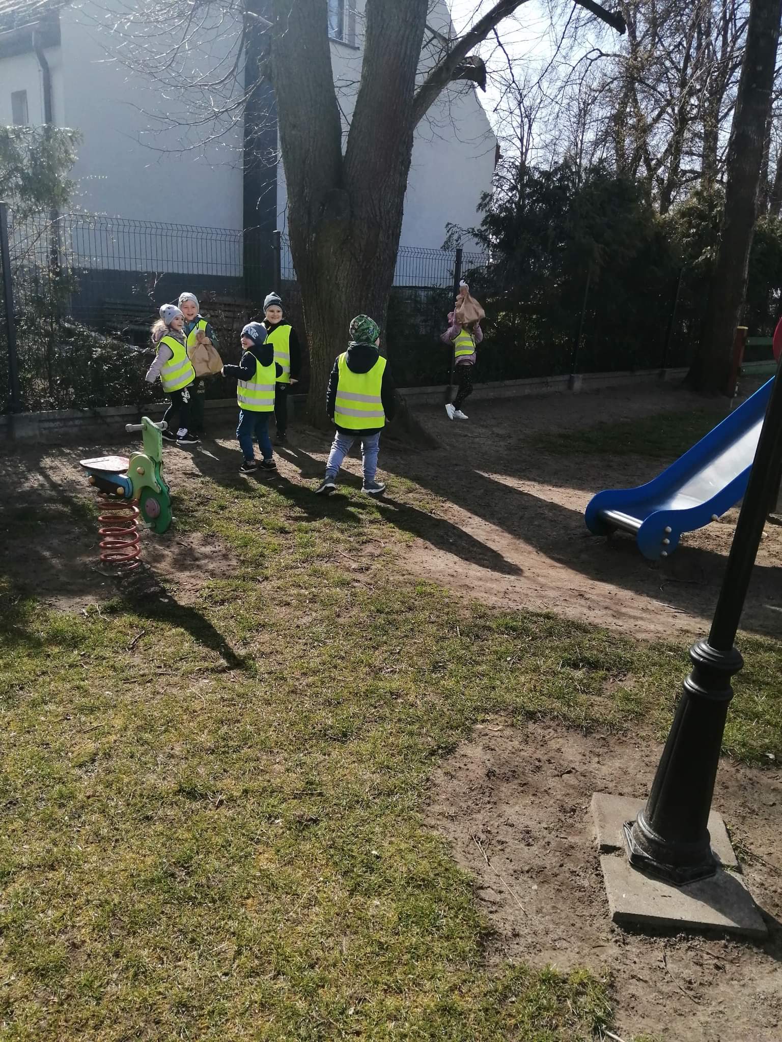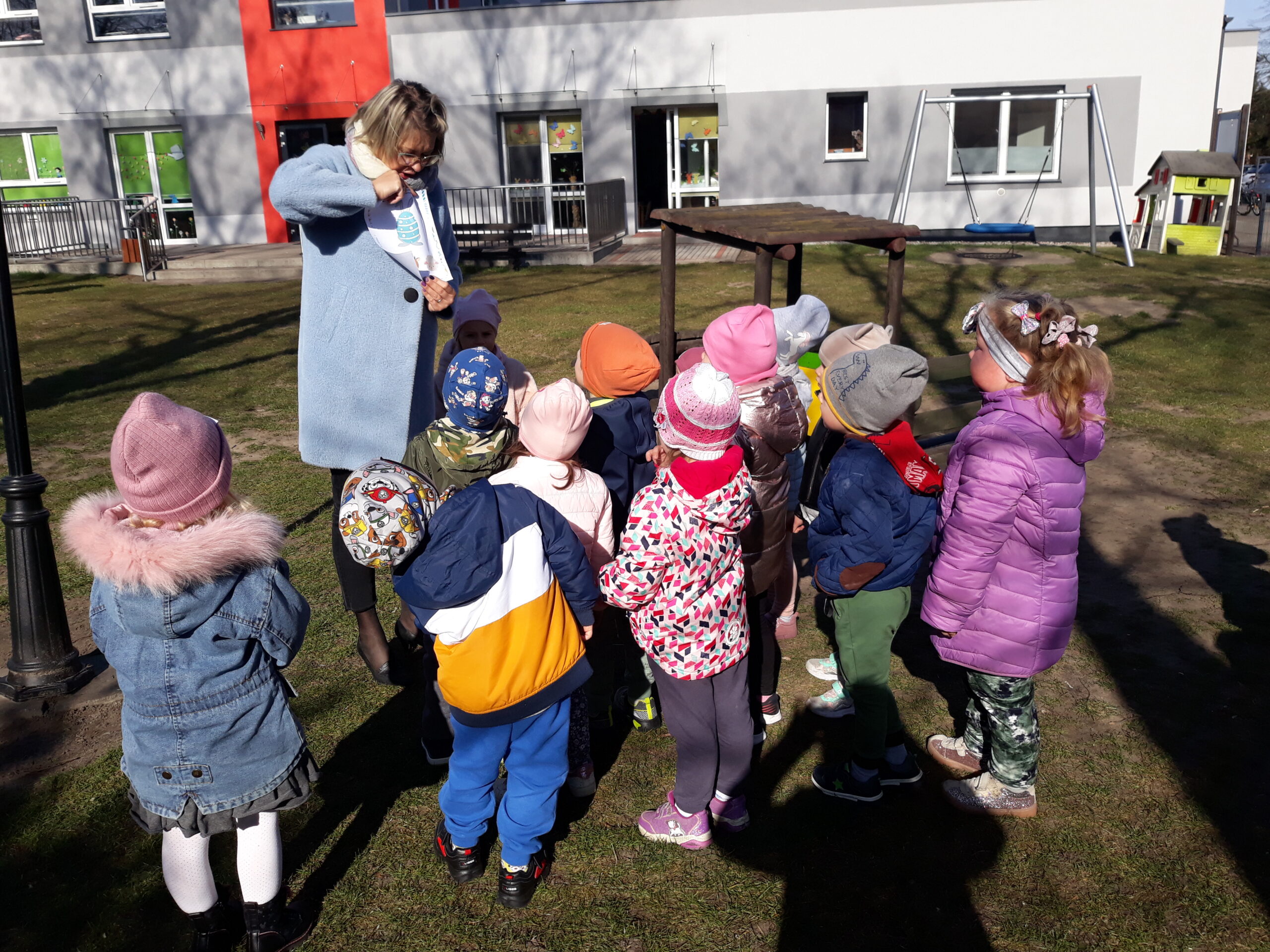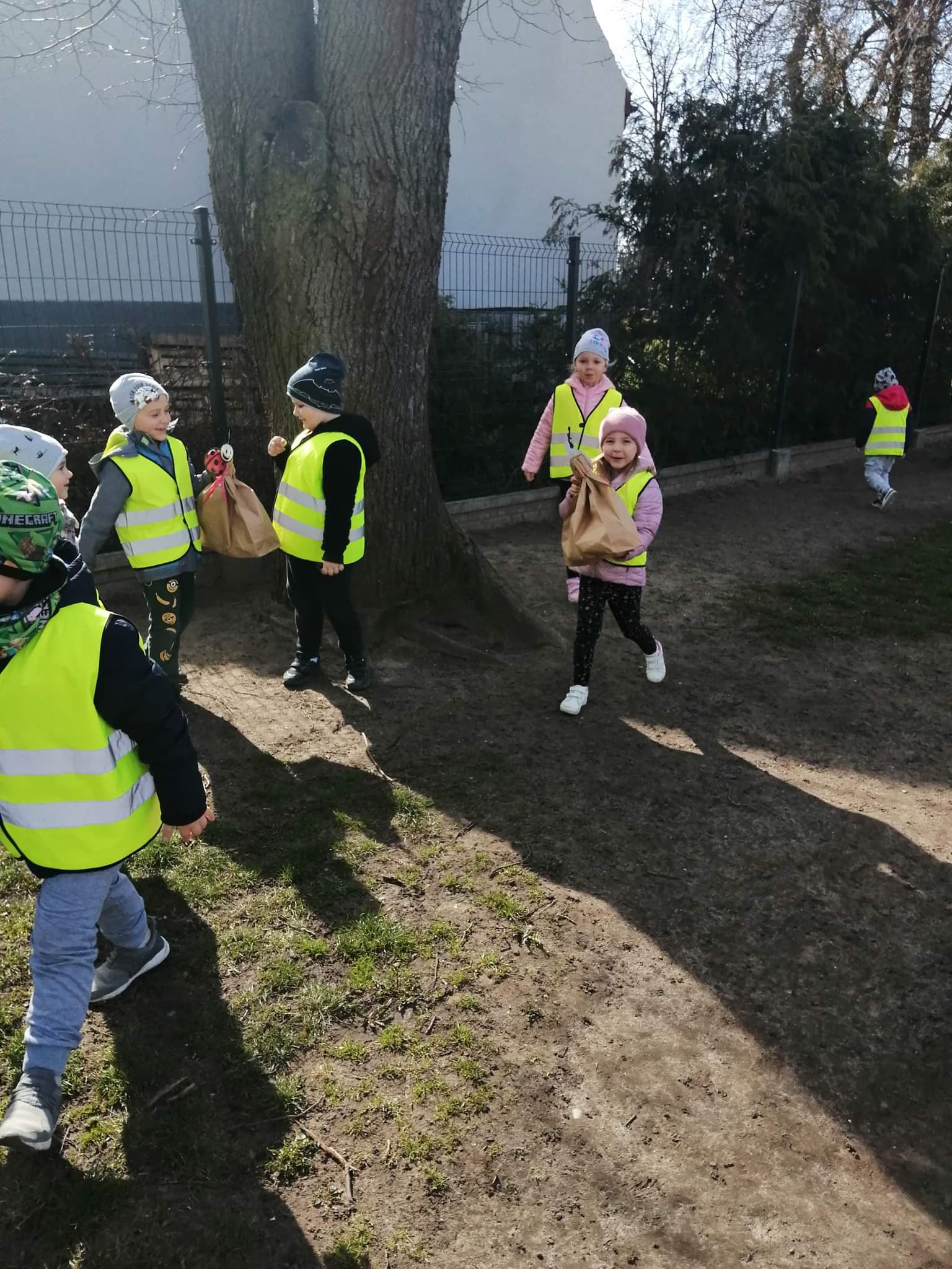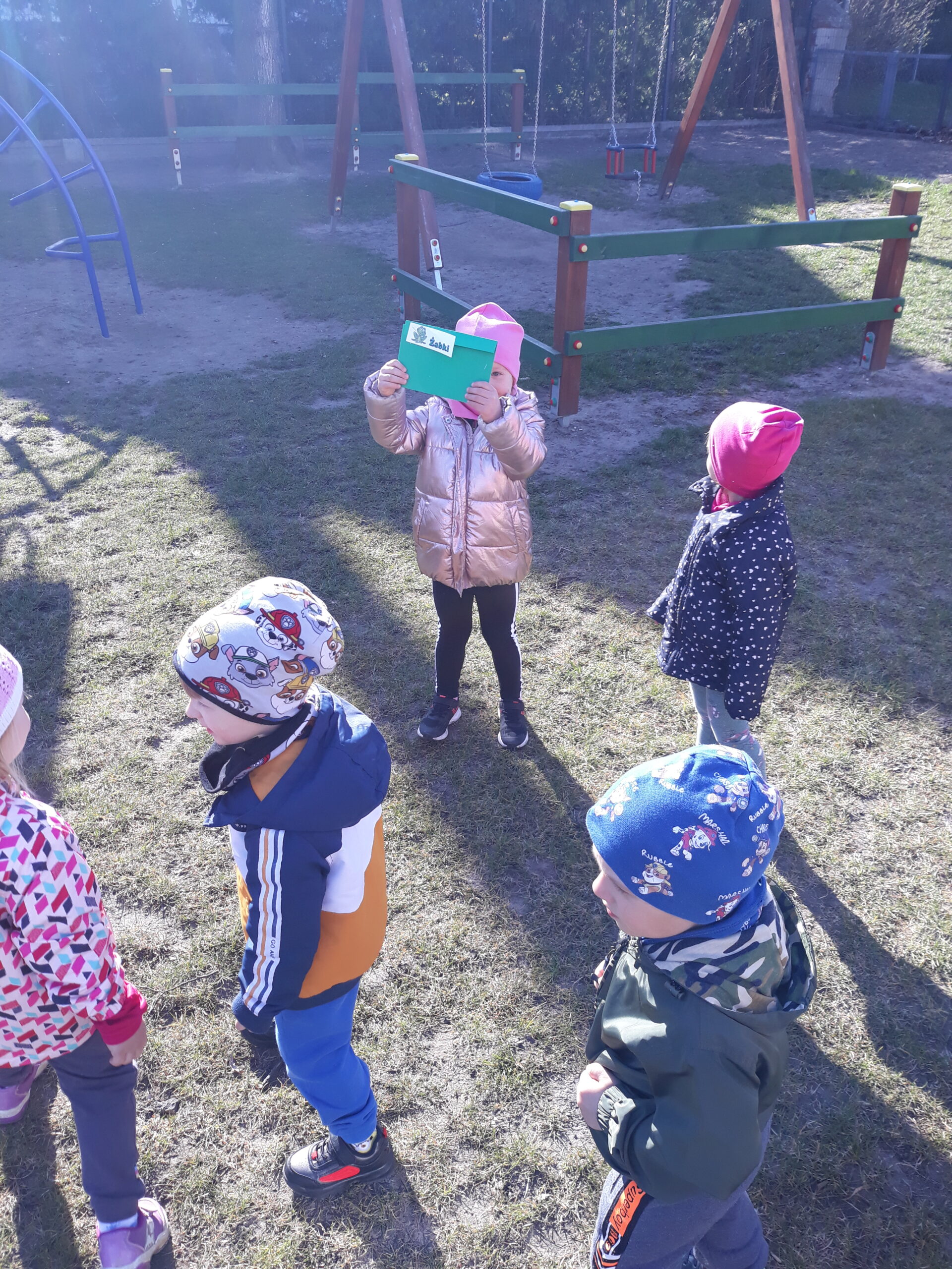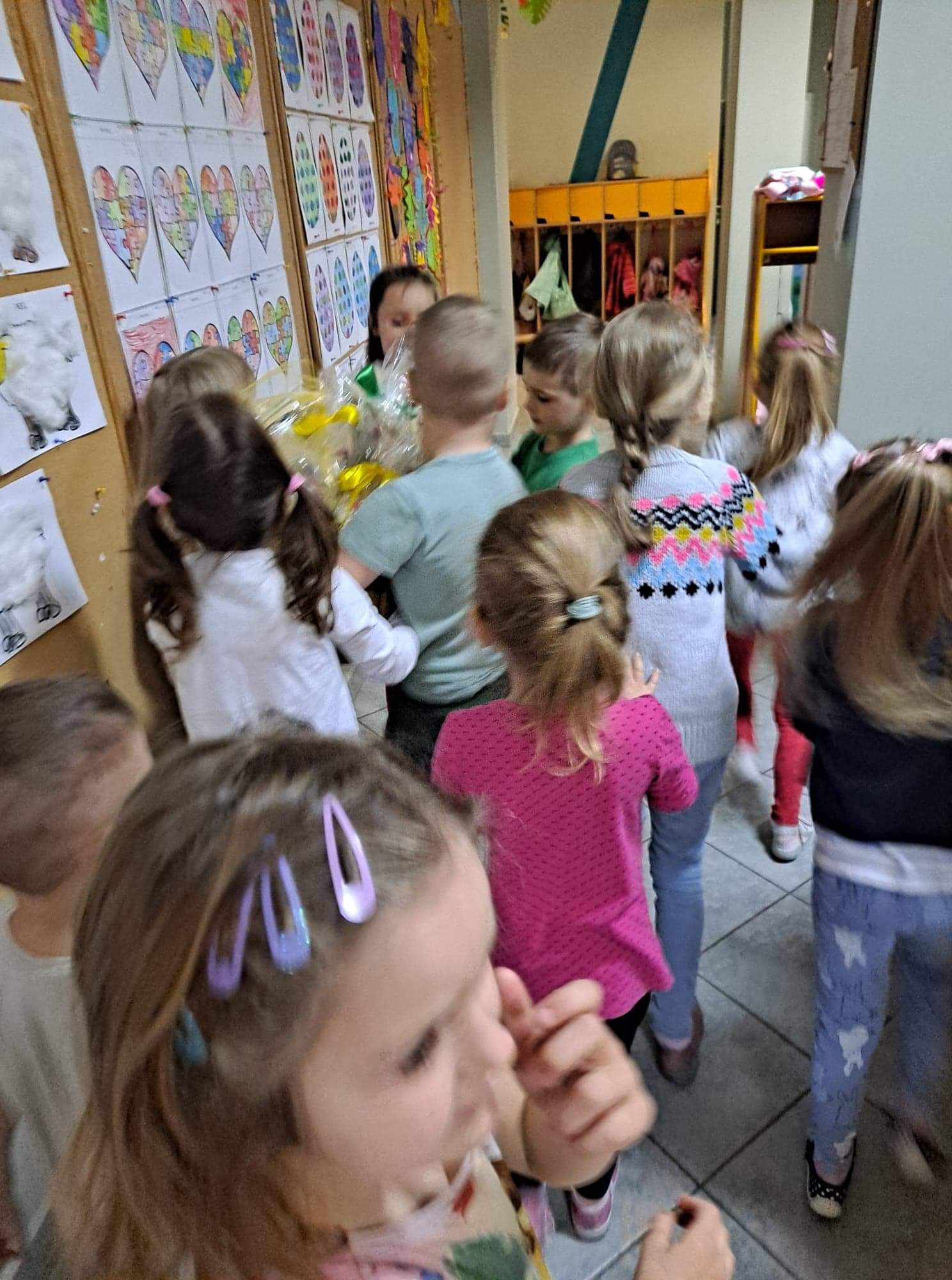 Jak co roku w okresie wielkanocnym przychodzi do naszego przedszkola zajączek Wielkanocny i w tajemniczy sposób zostawia dla wszystkich przedszkolaków koszyczki z prezentami. W tym roku zostawił również listy dla dzieci, w których ukryte były zadania do wykonania. Dzieci wykonywały z wielkim zaangażowaniem wszystkie zadania- śpiewały piosenki, recytowały wiersze. Koszyczki z niespodziankami ukryte były na terenie przedszkola. Dzieci z wielką radością szukały upominków zostawionych przez Zajączka.