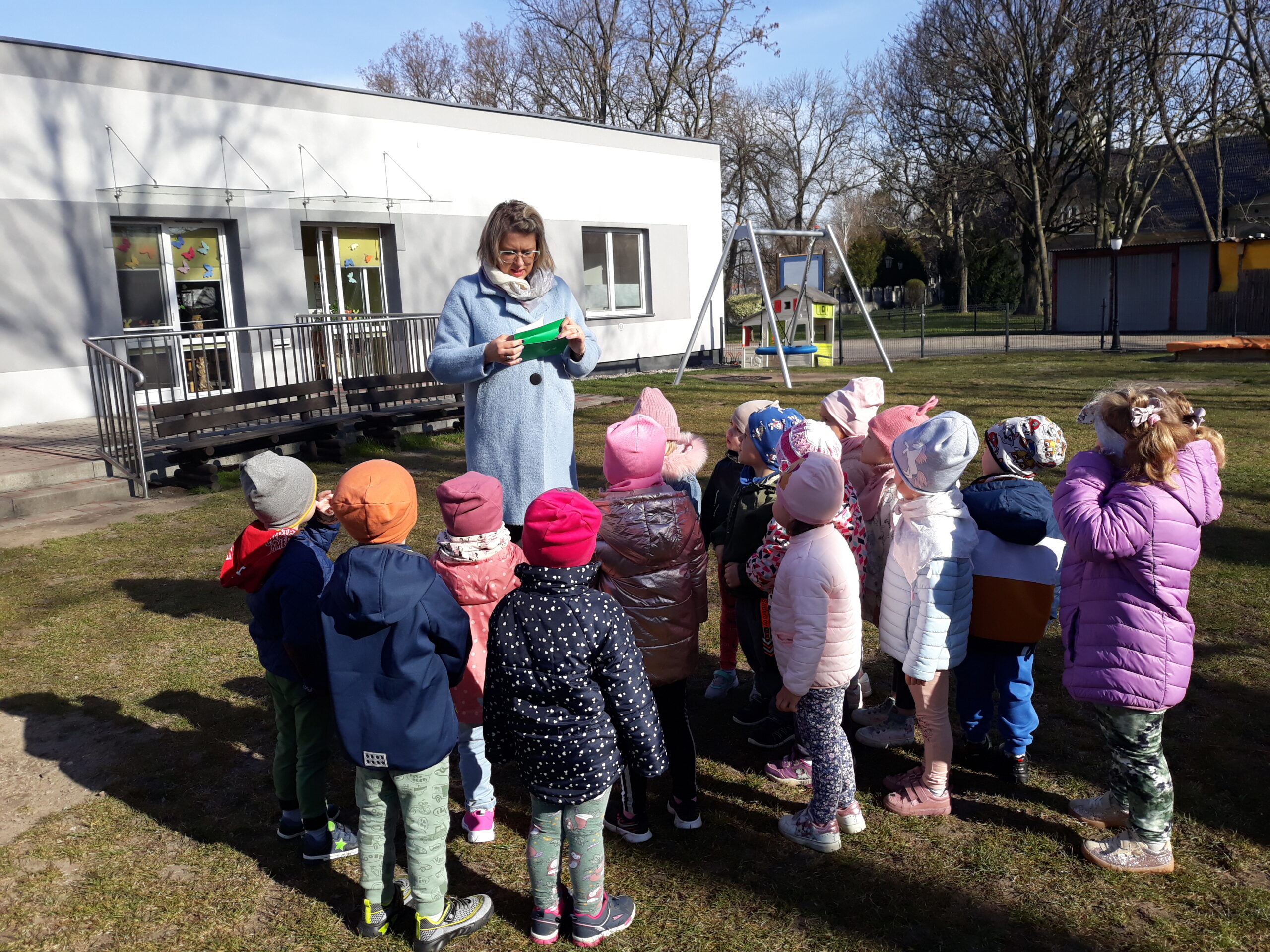 Jak co roku w okresie wielkanocnym przychodzi do naszego przedszkola zajączek Wielkanocny i w tajemniczy sposób zostawia dla wszystkich przedszkolaków koszyczki z prezentami.  W tym roku zostawił również listy dla dzieci, w których ukryte były zadania do wykonania. Dzieci wykonywały z wielkim zaangażowaniem wszystkie zadania- śpiewały piosenki, recytowały wiersze. Koszyczki z niespodziankami ukryte były na terenie przedszkola. Dzieci z wielką radością szukały upominków zostawionych przez Zajączka.