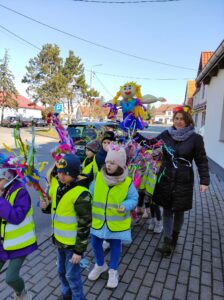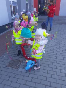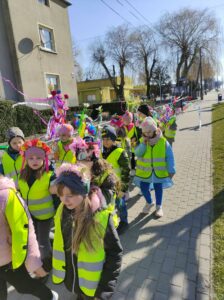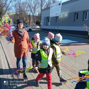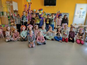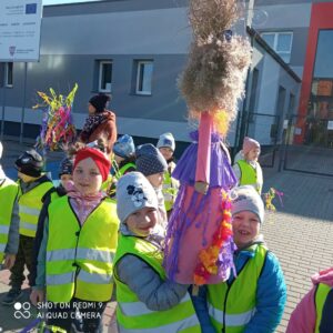 W naszym przedszkolu zaczęły się przygotowania do powitania wiosny. Na korytarzu przedszkolnym zmieniła się dekoracja z zimowej na wiosenną. W salach zazieleniły się kąciki przyrody, a przedszkolaki wraz z wychowawcami zabrały się w tworzeniu słomianej kukły Marzanny – symbolu odchodzącej Zimy. Wykonały także gaik. Wiosenną gałązkę ozdabiały kwiatkami z papieru i kolorowymi bibułkami. Nie zabrakło również prac plastycznych, dotyczących pierwszych zwiastunów wiosny. 21 marca wszystkie grupy przedszkolne zebrały się, aby przejść w wiosennym korowodzie ulicami Damasławka. Uśmiechnięci i zadowoleni wróciliśmy do przedszkola.