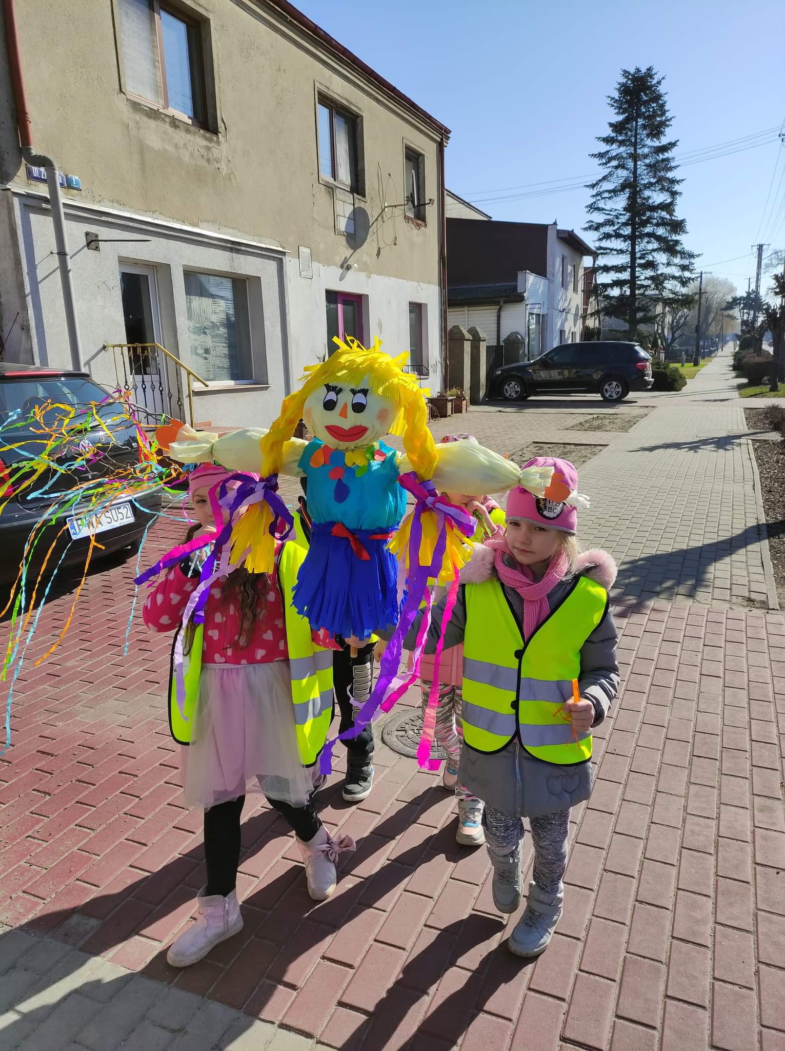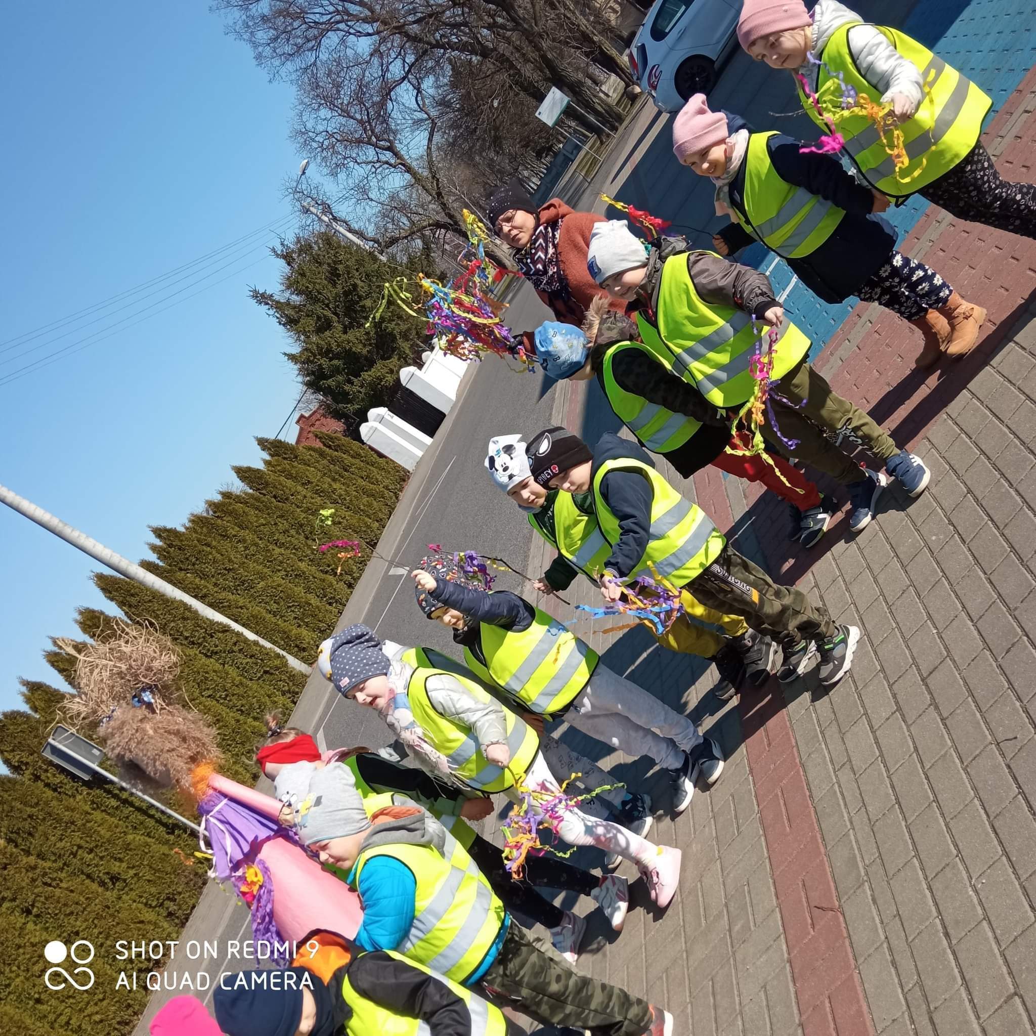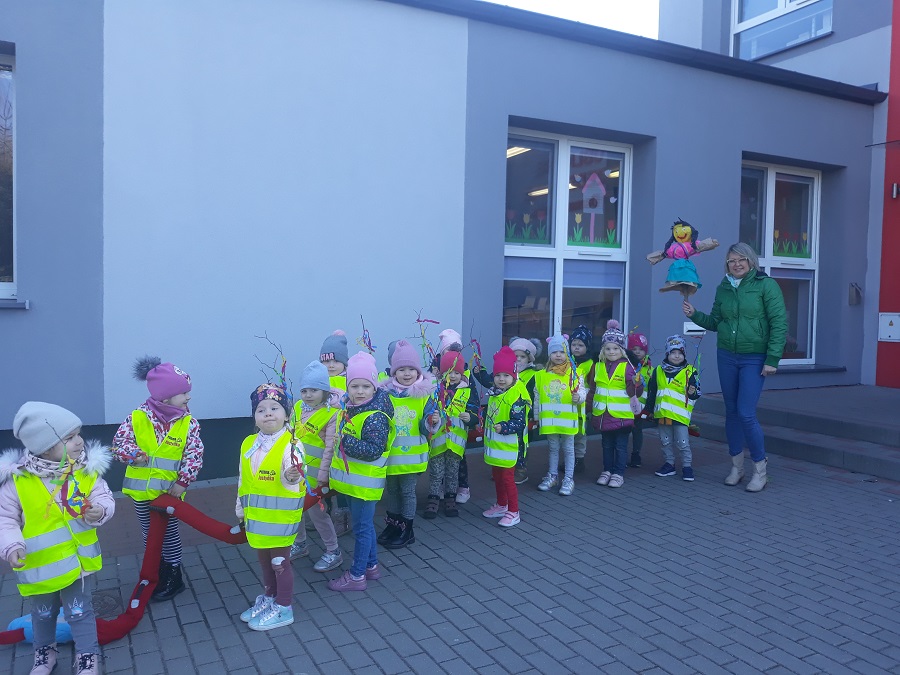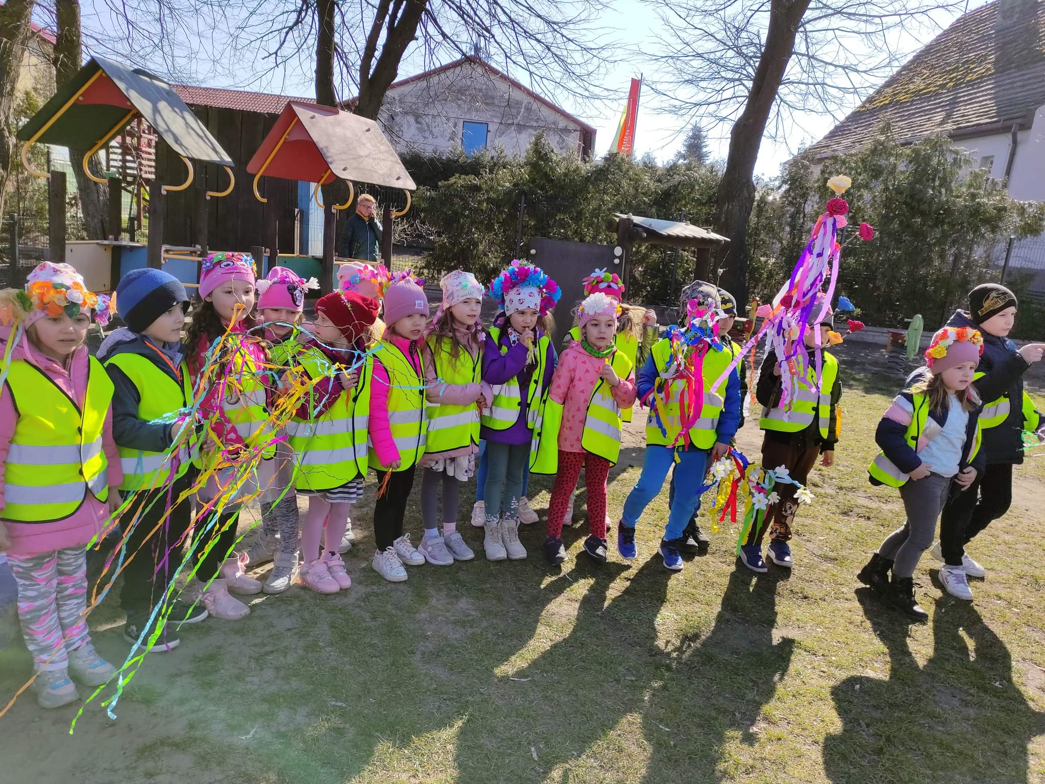 W naszym przedszkolu zaczęły się przygotowania do powitania wiosny. Na korytarzu przedszkolnym zmieniła się dekoracja z zimowej na wiosenną. W salach zazieleniły się kąciki przyrody, a przedszkolaki wraz z wychowawcami zabrały się w tworzeniu słomianej kukły Marzanny – symbolu odchodzącej Zimy. Wykonały także gaik. Wiosenną gałązkę ozdabiały kwiatkami z papieru i kolorowymi bibułkami. Nie zabrakło również prac plastycznych, dotyczących pierwszych zwiastunów wiosny. 21 marca wszystkie grupy przedszkolne zebrały się, aby przejść w wiosennym korowodzie ulicami Damasławka. Uśmiechnięci i zadowoleni wróciliśmy do przedszkola.