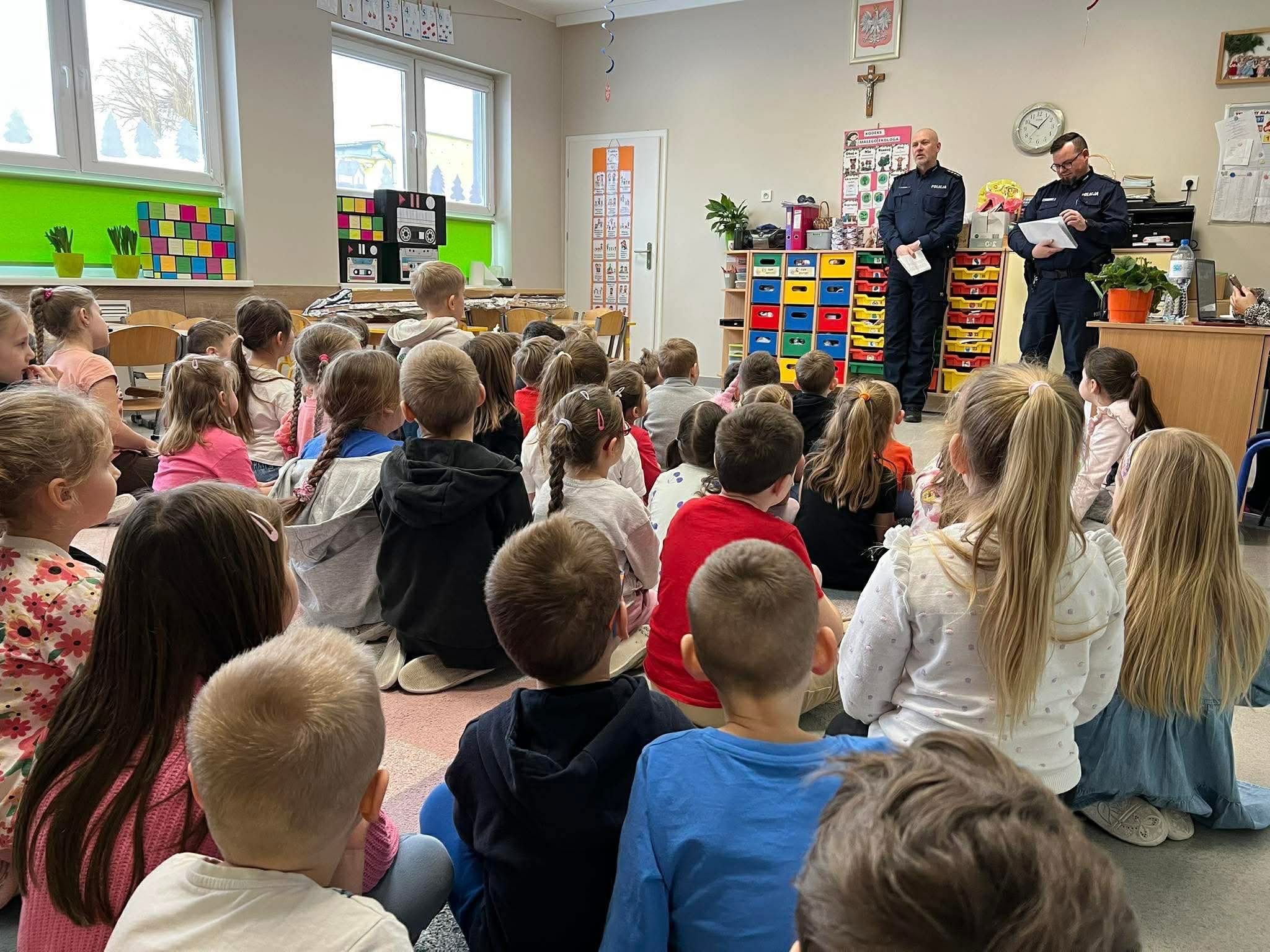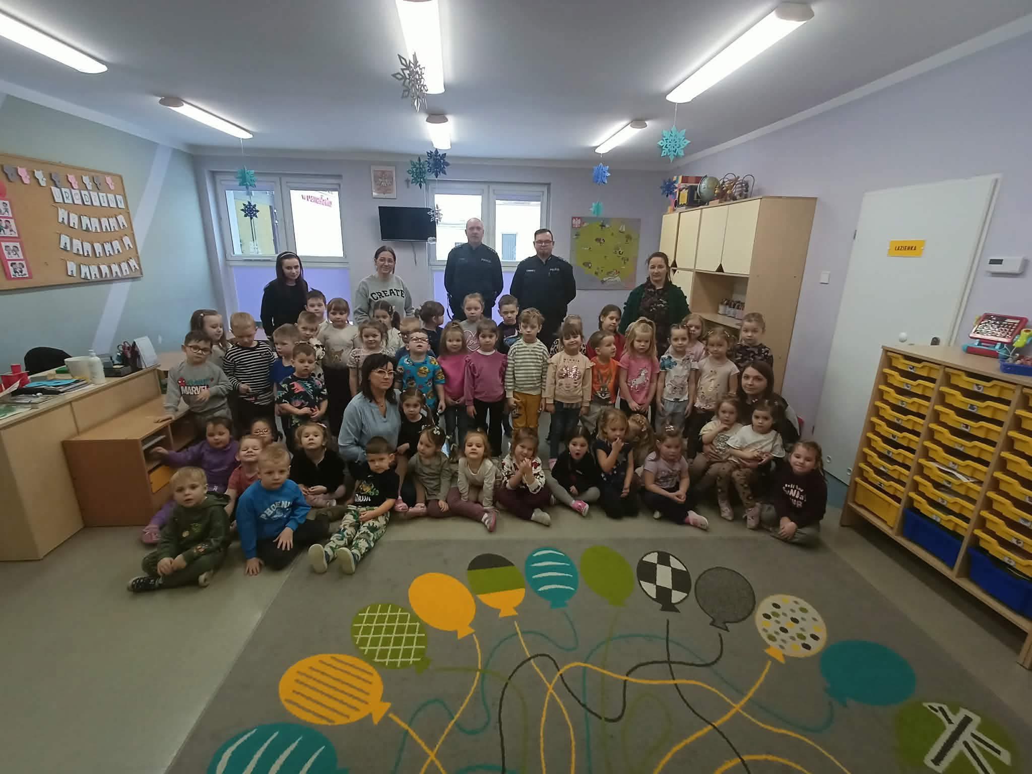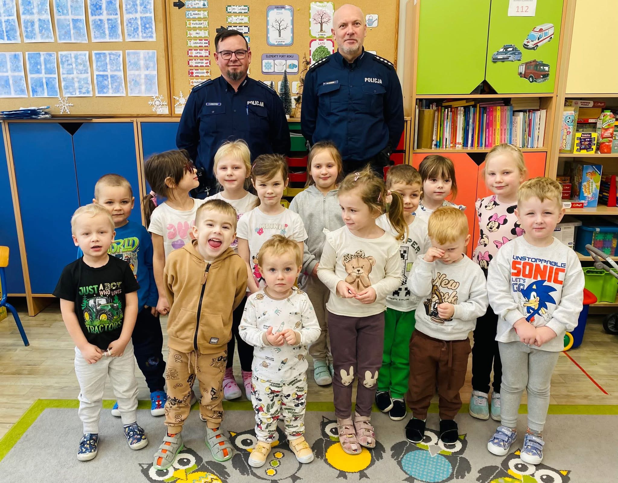 W 艣rod臋, dnia 4 lutego w naszym przedszkolu odby艂o si臋 spotkanie przedszkolak贸w z funkcjonariuszami policji Komenda Powiatowa Policji w W膮growcu- Dzielnicowym Zespo艂u ds. Prewencji w Damas艂awku, asp. szt. Dariuszem Nowakiem oraz m艂. asp. Paw艂em Kosmowskim. Celem spotkania by艂o zapoznanie dzieci z zasadami bezpiecznego sp臋dzania ferii zimowych. Panowie policjanci w ciekawy spos贸b, z wykorzystaniem plansz edukacyjnych, om贸wili zasady bezpiecze艅stwa podczas zabaw na 艣niegu i lodzie. Dzieci dowiedzia艂y si臋, jak bezpiecznie zje偶d偶a膰 na sankach, dlaczego nie wolno bawi膰 si臋 na zamarzni臋tych zbiornikach wodnych oraz jak wa偶ne jest noszenie element贸w odblaskowych podczas spacer贸w. Funkcjonariusze przypomnieli r贸wnie偶 zasady bezpiecznego poruszania si臋 po drodze. Przedszkolaki aktywnie uczestniczy艂y w spotkaniu, odpowiada艂y na pytania i dzieli艂y si臋 w艂asnymi do艣wiadczeniami. Na zako艅czenie dzieci podzi臋kowa艂y policjantom za wizyt臋 i cenne wskaz贸wki. Panowie policjanci mieli tak偶e dla wszystkich dzieci niespodziank臋 w postaci s艂odkich upomink贸w.